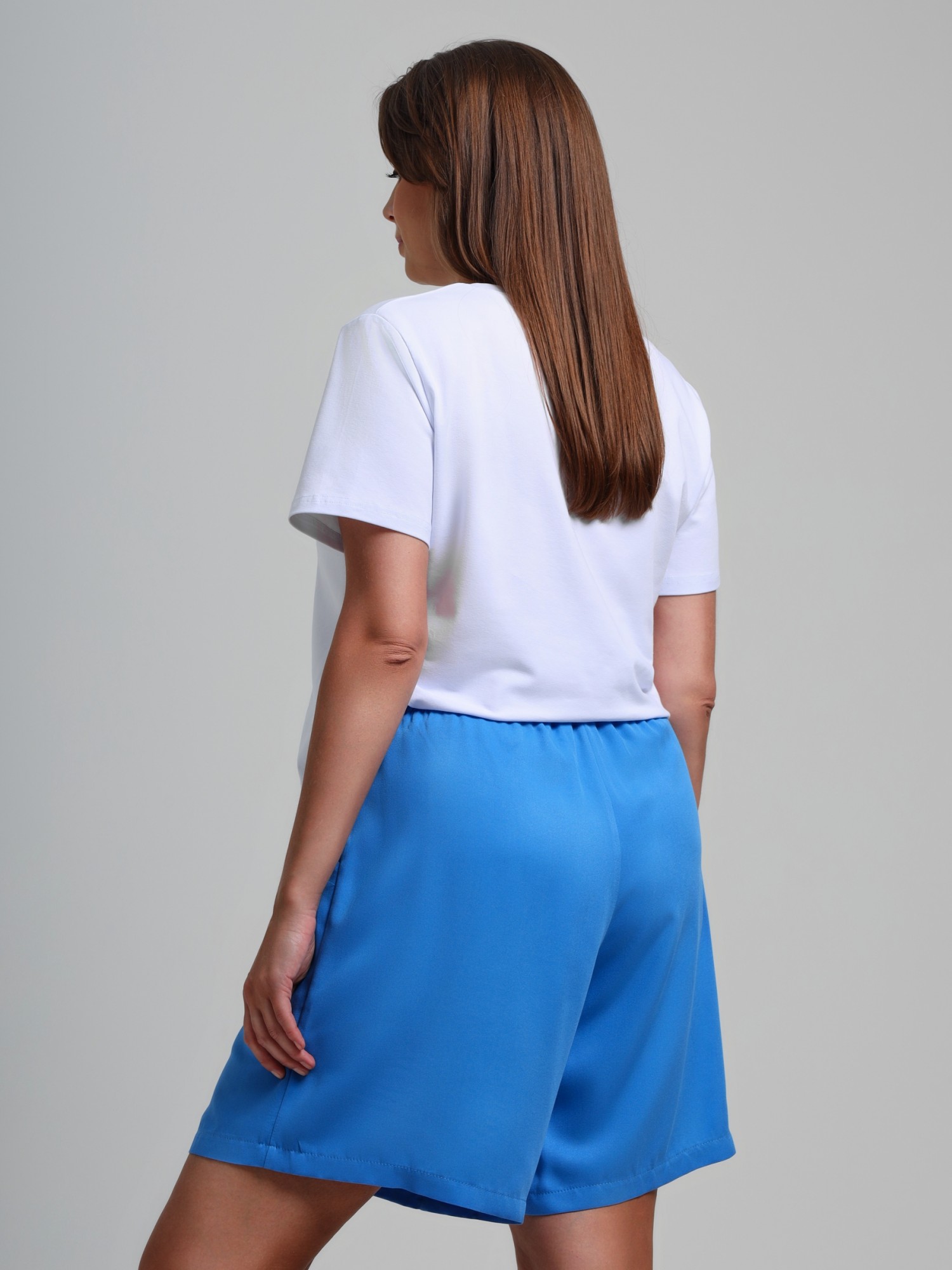 Шорты женские из гладкокрашеного тканого штапельного полотна, свободные, с карманами в боковых швах, на притачном поясе с эластичной тесьмой внутри. Средний шов передних половин обработан имитацией «гульфика»,