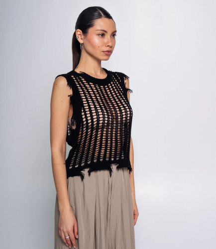 Топ-жилетка с крупной сеткой - это модный и элегантный элемент гардероба, который может служить как самостоятельным верхом или как дополнительный слой к другим нарядам. Топ-жилетка с крупной сеткой обеспечивает воздухопроницаемость и добавляет изысканности образу. Крупная сетка создает интересный текстурный эффект и позволяет выделяться из толпы. Этот стильный элемент гардероба позволяет экспериментировать с различными комбинациями одежды. Ее можно надеть на топ или платье, добавляя слой прозрачности и изящности. Он также может использоваться как дополнение к купальному костюму или быть частью фестивального наряда. Рост моделт 174 см, 80-58-88.