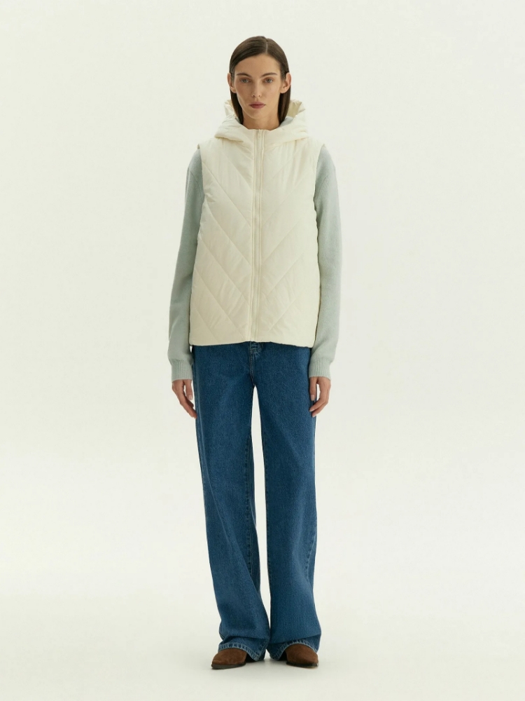Мягкий стёганый жилет прямого кроя в универсальном молочном цвете. Модель без рукавов дополнена комфортным капюшоном. Имеет карманы по бокам. Застёгивается на удобную молнию. Жилет с синтепоновым наполнителем может выступать как самостоятельная верхняя одежда на прохладную погоду или как составляющая многослойного образа. Температурный режим до 5 °C