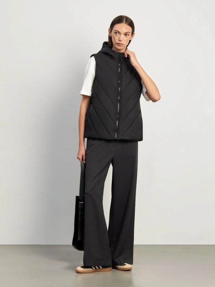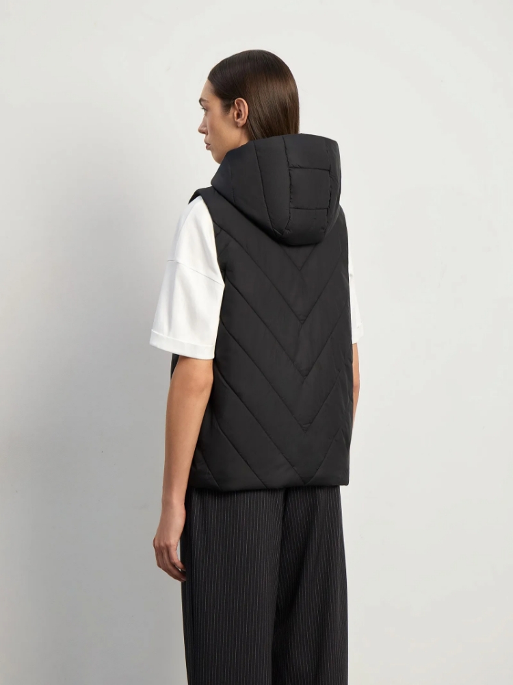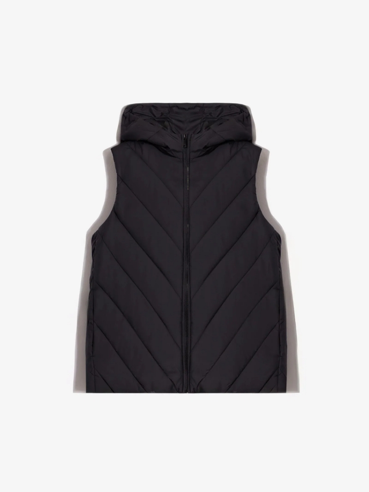 Мягкий стёганый жилет прямого кроя в универсальном чёрном цвете. Модель без рукавов дополнена комфортным капюшоном. Имеет карманы по бокам. Застёгивается на удобную молнию. Жилет с синтепоновым наполнителем может выступать как самостоятельная верхняя одежда на прохладную погоду или как составляющая многослойного образа. Температурный режим до 5 °C