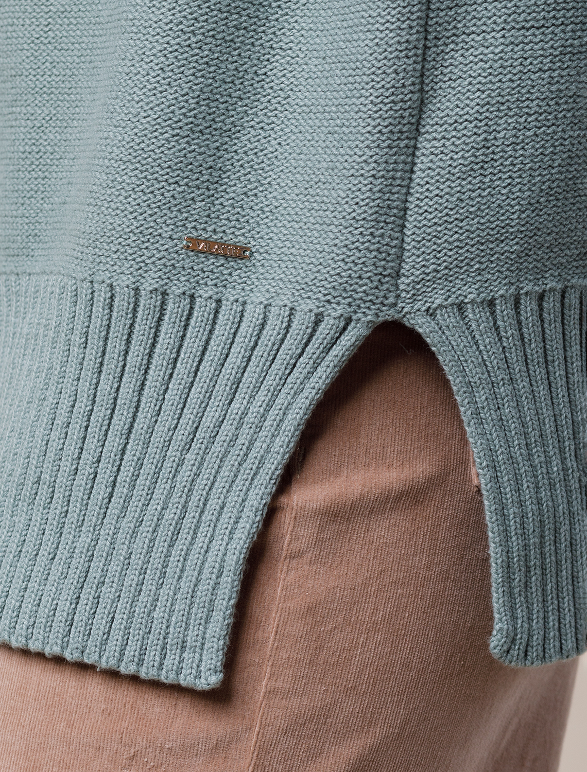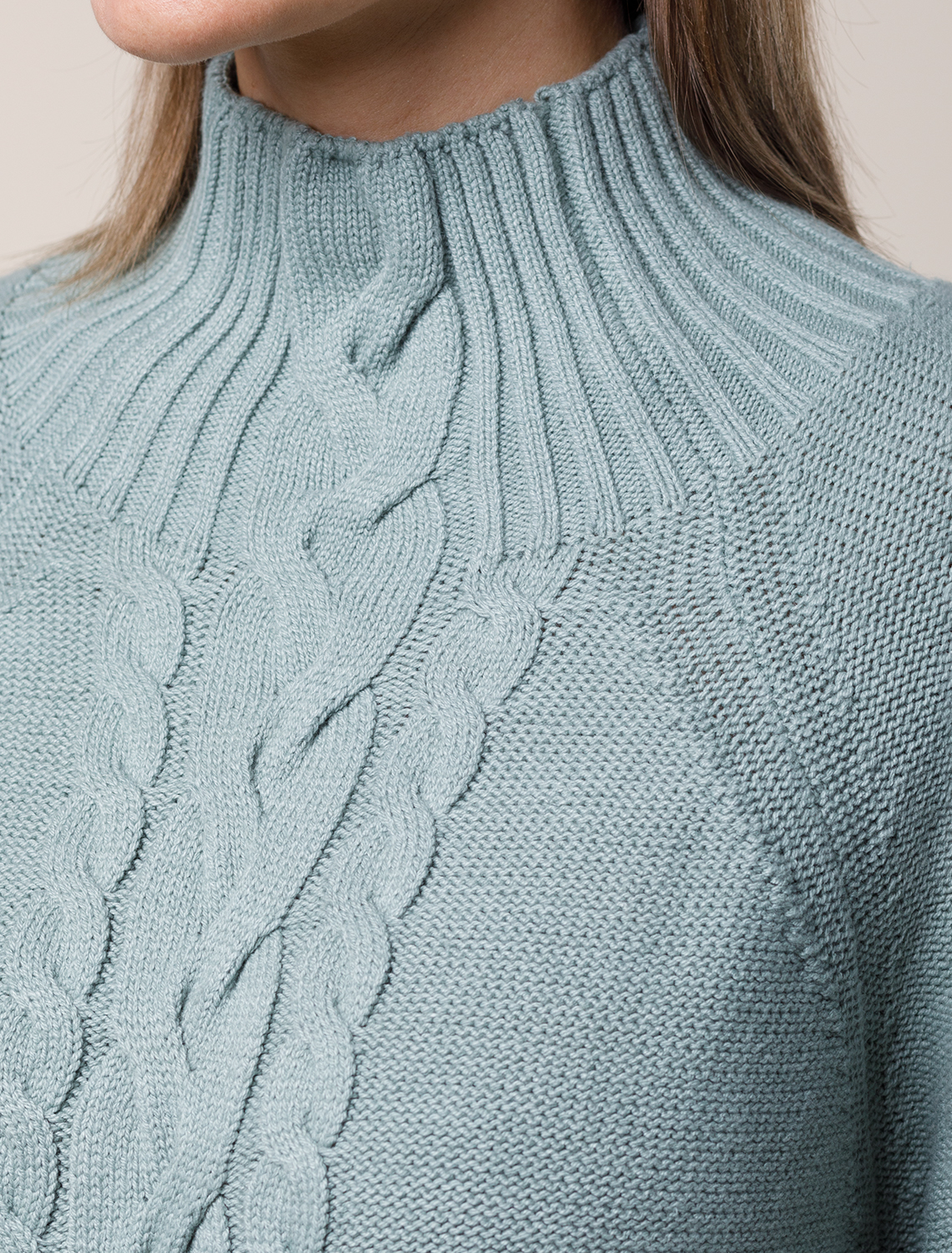 Свитер выполнен из мягкой хлопковой пряжи фактурной вязки с добавлением акрила. Модель связана изнаночной петлей, в сочетании с которой узор косы и высокие рибаны поддерживают ирландский стиль, который всегда в тренде. Комфортный ворот стойка хорошо защищает от ветра. Боковые разрезы поддерживают расслабленный свободный силуэт. Изделие сочетается с любым низом и не требует дополнительных аксессуаров.