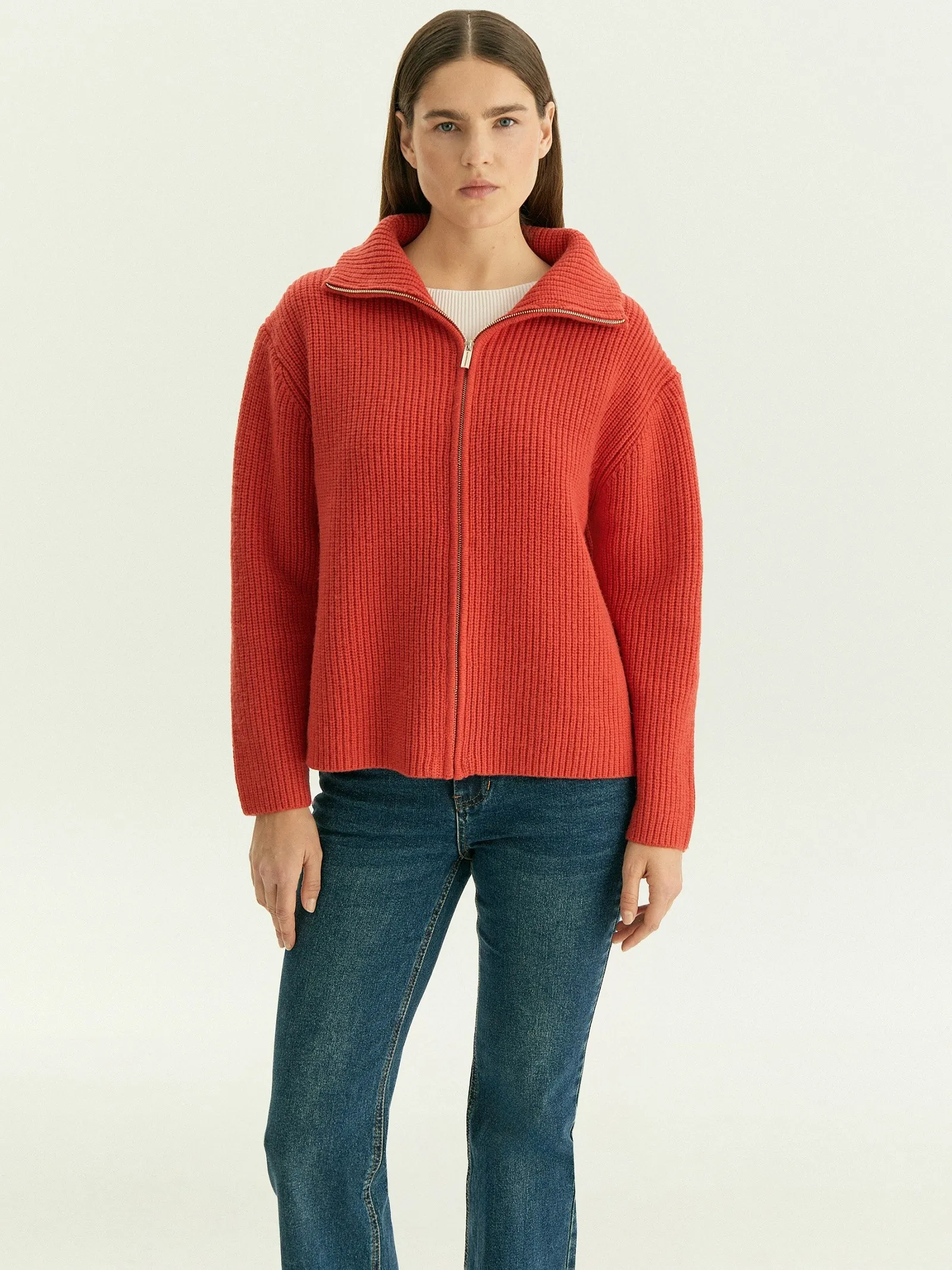 Джемпер на молнии — удобный утепляющий слой для повседневных образов. Горловину можно расстегнуть, разложив по плечам на манер воротника "апаш".