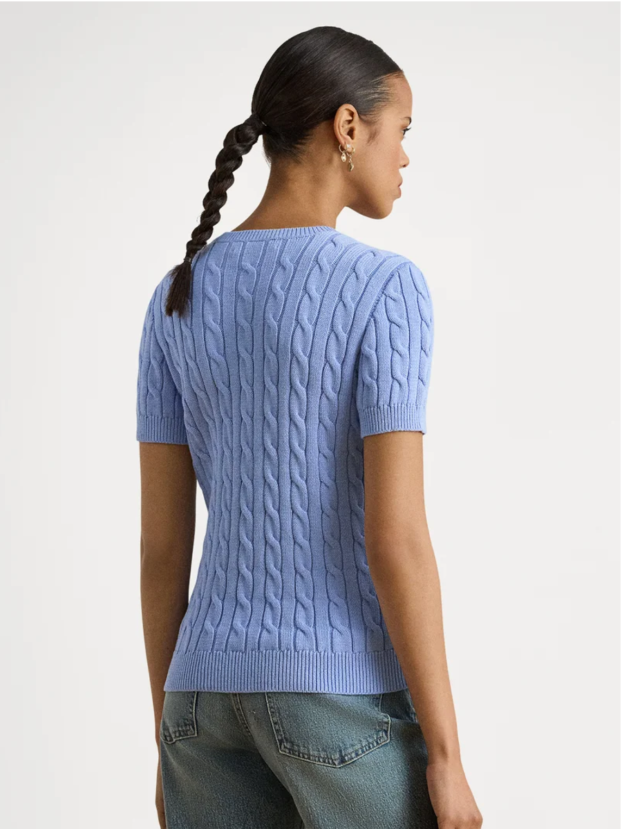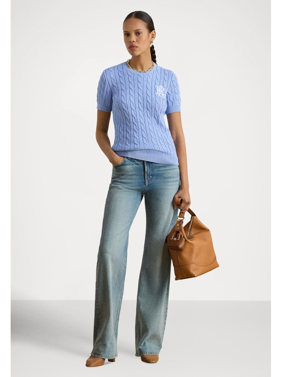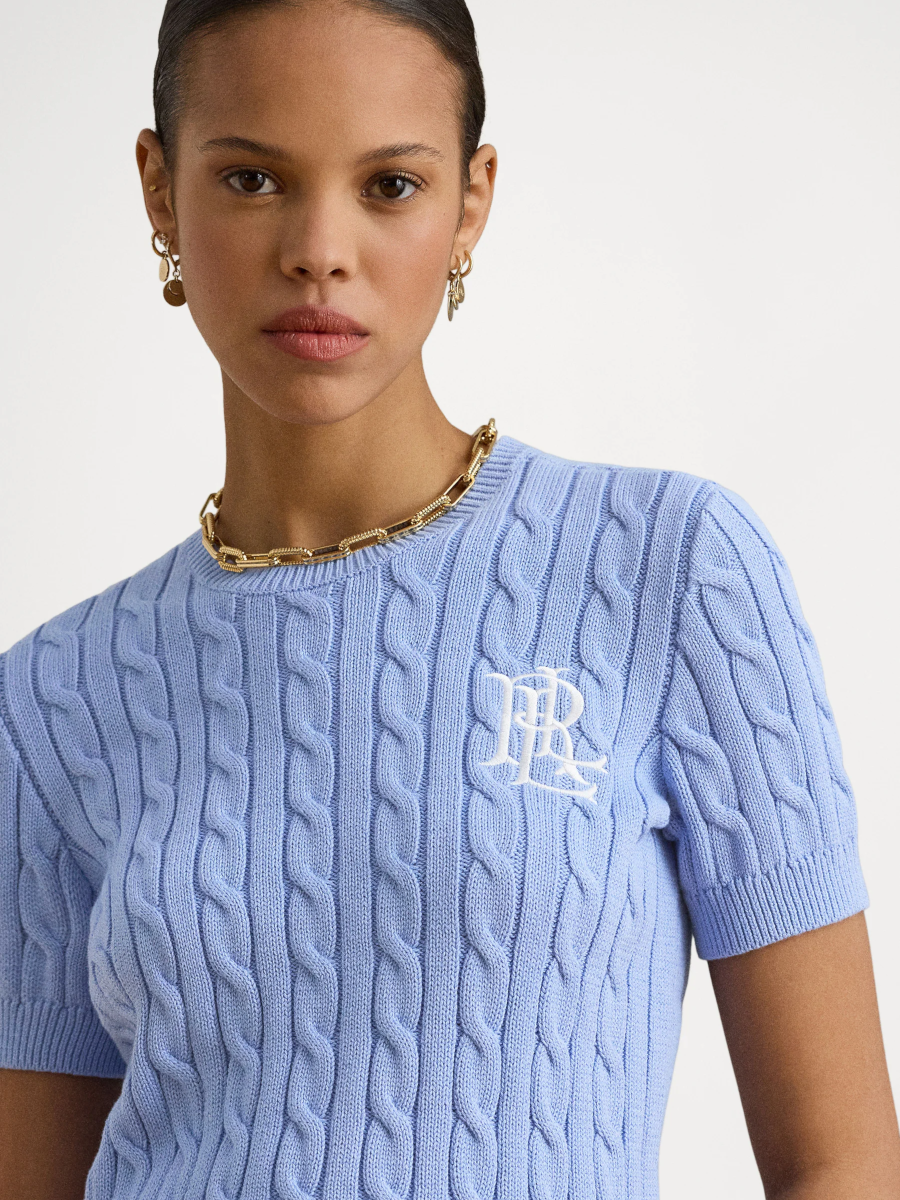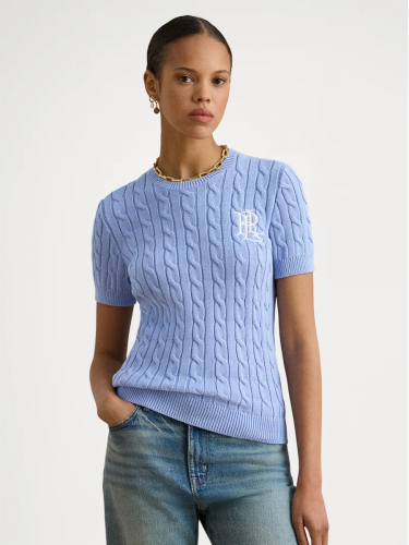 Этот свитер крупной вязки с круглым вырезом и короткими рукавами, изготовленный из легкой хлопковой пряжи, украшен вышитым логотипом "LRL" на груди и идеально подходит для ежедневной носки.