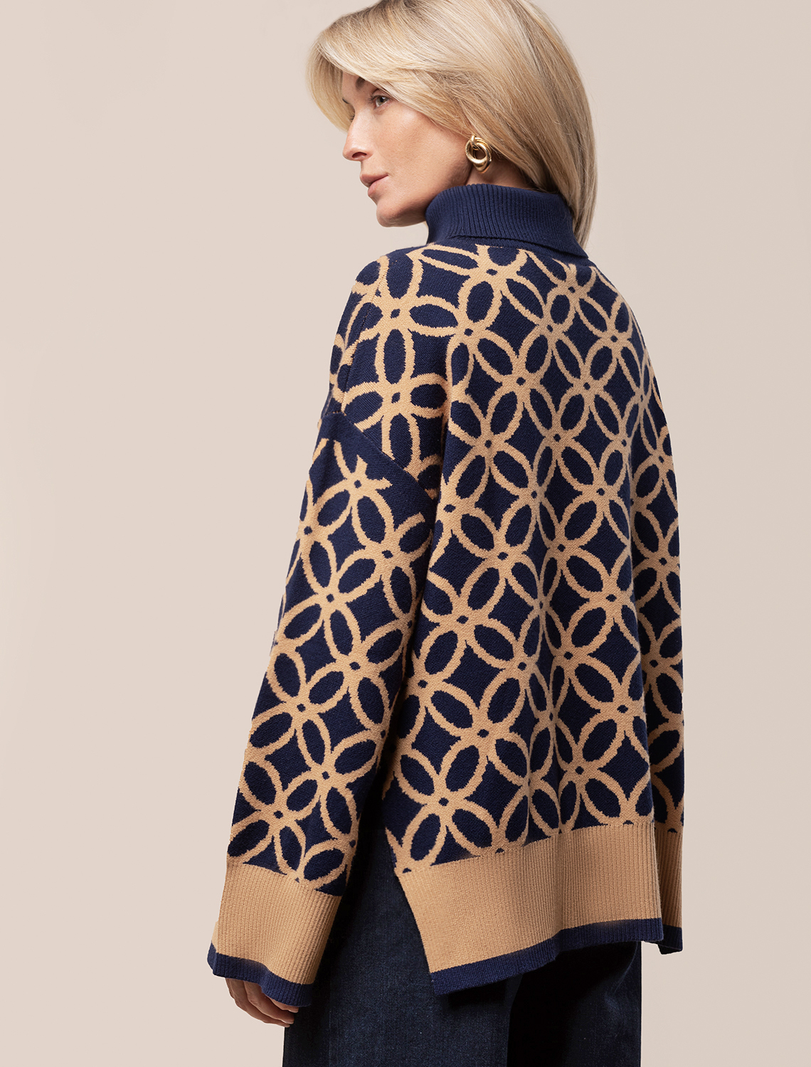 Свитер с боковыми разрезами жаккардовой вязки с кашемиром D34.147 синий-бежевый