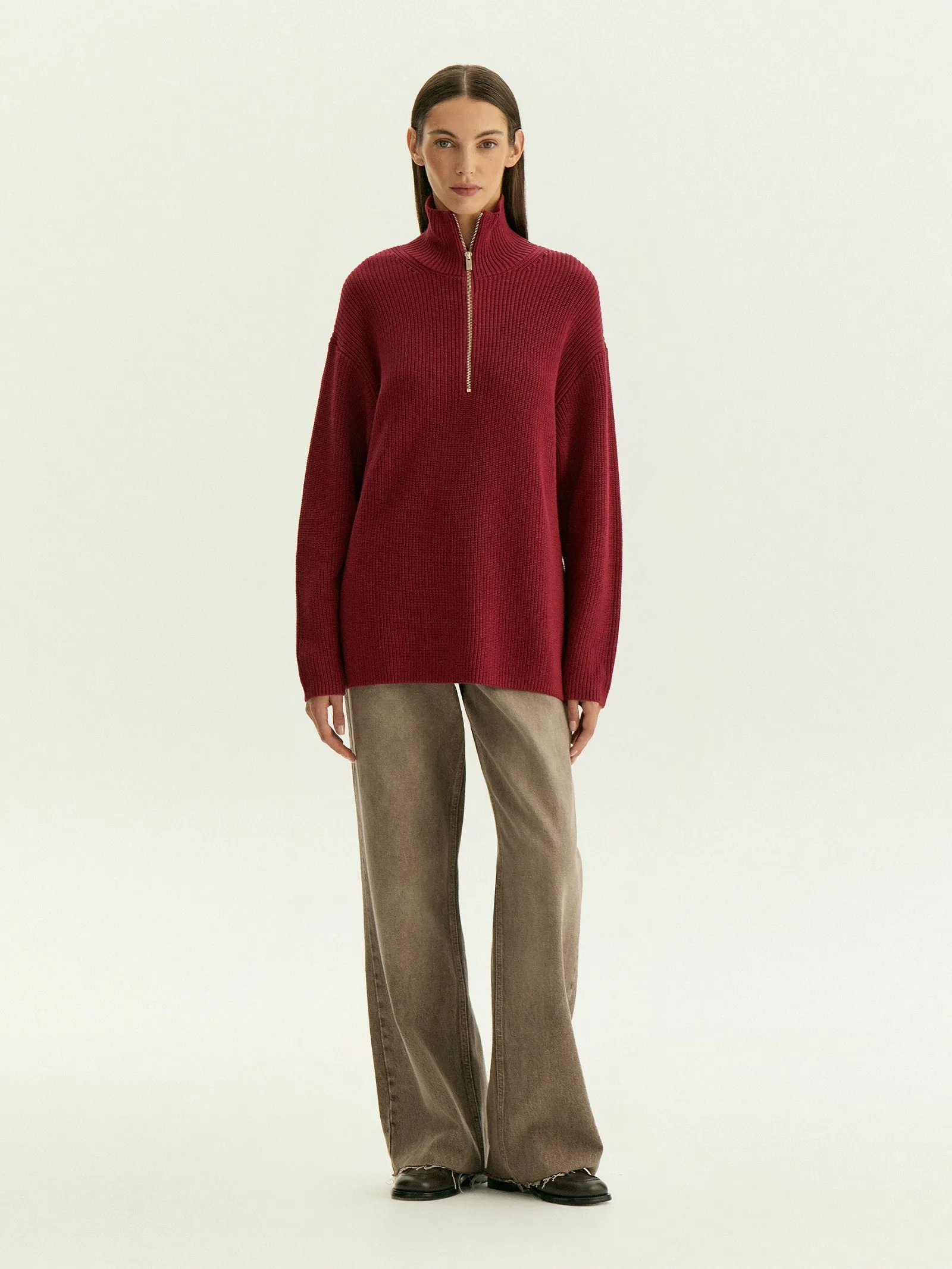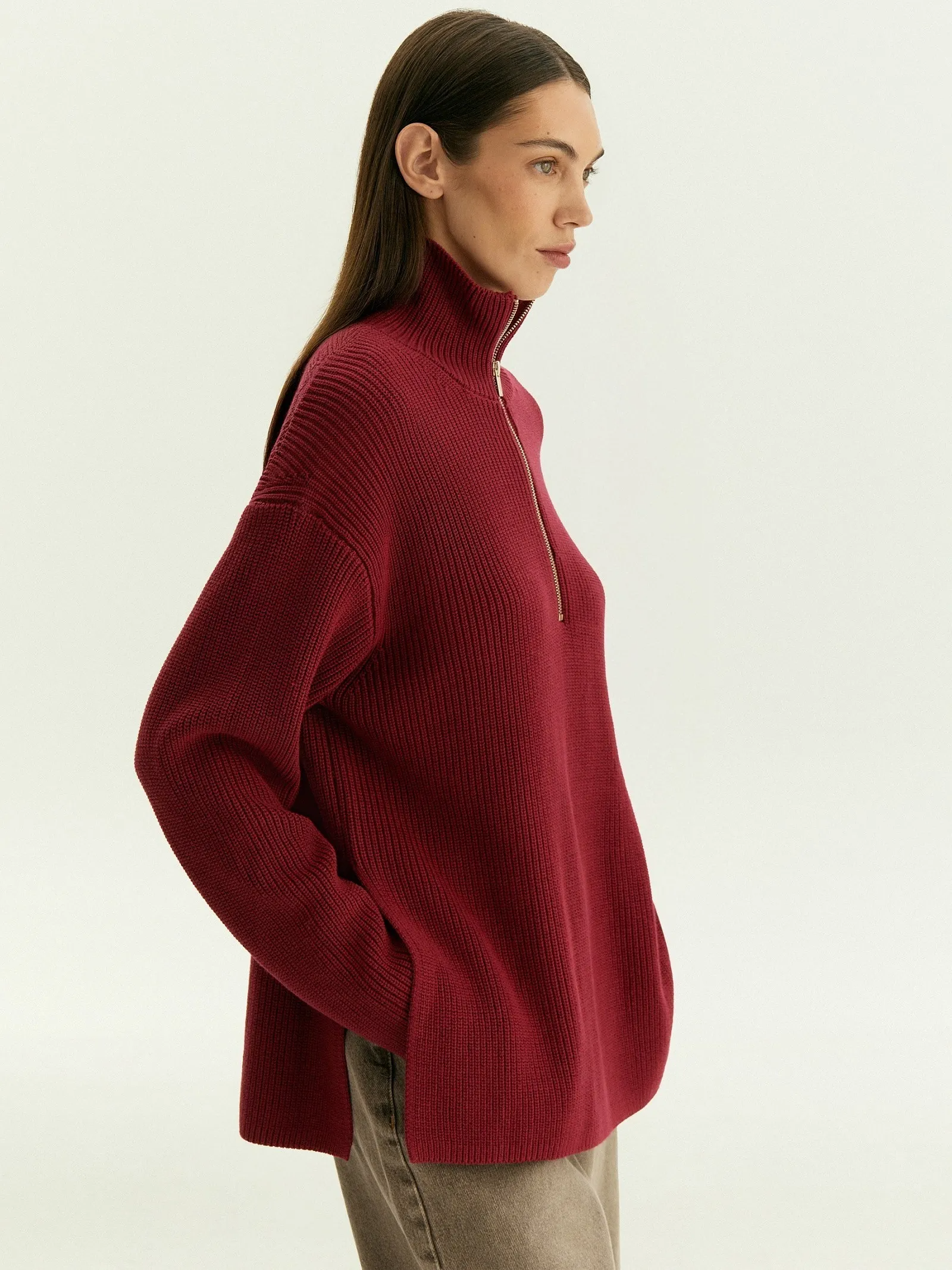 Хлопковый джемпер в винном оттенке с золотой фурнитурой — то, что нужно на каждый день. Удобная модель с горловиной на молнии идеальна на демисезон. Полностью натуральный материал комфортно ощущается в любую погоду. Красивое сочетание цветов вносит приятное разнообразие в повседневные образы. Удлинённая спинка и разрезы по бокам делают стилизации с джемпером интереснее. Его можно по-разному заправлять, обыгрывать поясами, создавать с ними многослойные образы.