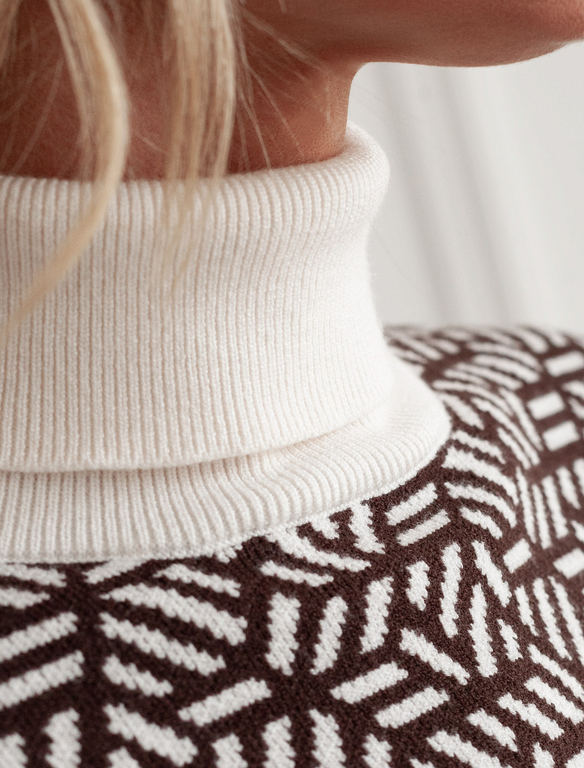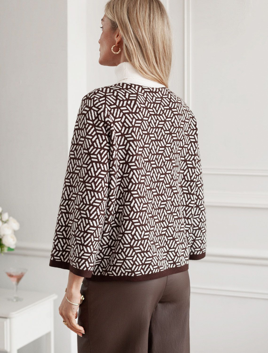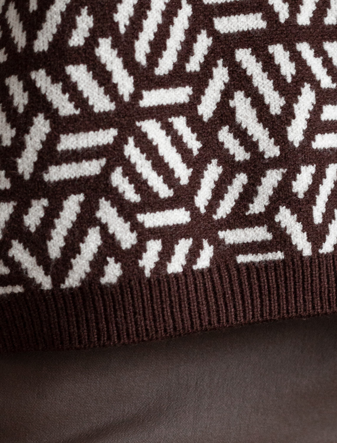 Свитер жаккардовой вязки выполнен из нежной пряжи на основе вискозы с добавлением кашемира. Модель свободного силуэта с укороченным рукавом подходит для любой фигуры. Жаккардовый узор выглядит дорого и роскошно, делая любой образ респектабельным. Нежная пряжа комфортно ощущается на теле, сохраняя оптимальное тепло при этом не перегревая кофейный