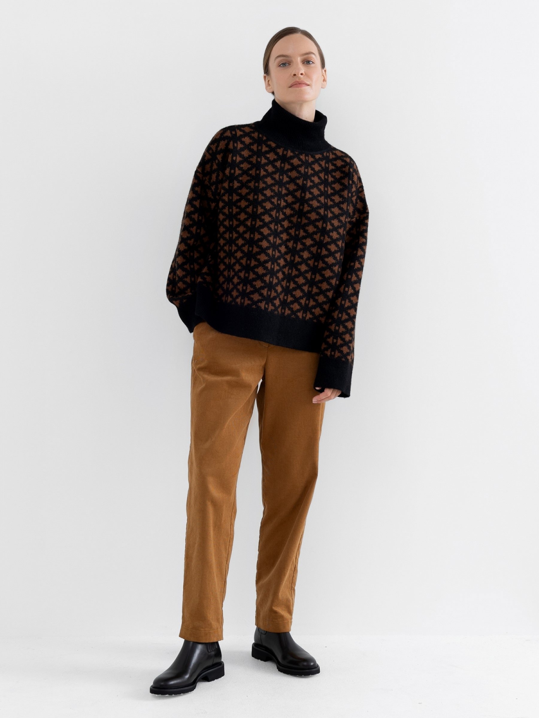 Этот свитер – хорошее решение, когда хочется добавить в образ акцент, но при этом не сделать лук слишком ярким или нарядным. Всё решает равномерный геометрический принт с участием спокойных базовых цветов. Чтобы вам было не только красиво, но и удобно, модель выполнена в прямом свободном силуэте, из мягкого теплого вискозного полотна с добавлением шерсти.