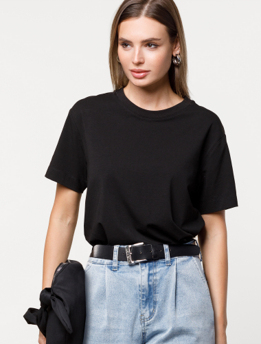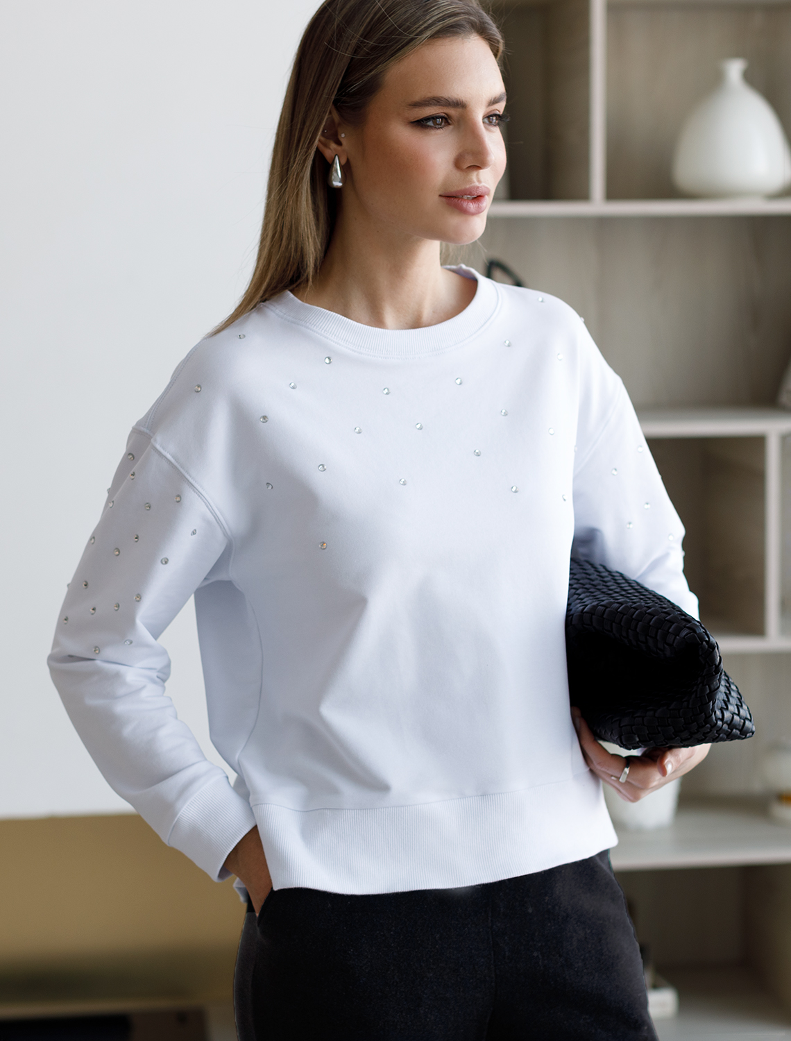 Свитшот выполнен из эластичного футера двухнитки. Изделие дополнили лаконичным принтом стразами в тон изделия. Расслабленный стиль поддерживает спущенная линия плеча, свободный силуэт и разрезы по бокам. Модель сочетается в костюме с брюками D44.135, D44.136, D44.137 и юбкой D46.034 75%Хлопок 20%ПЭ 5%ПУ