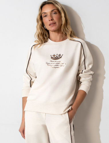 Стильный свитшот овсяного цвета с эффектом меланж из премиального футера двухнитки с эластаном сочетает в себе комфорт и оригинальность. Джемпер выполнен из натурального хлопка, который обеспечивает мягкость и дышащие свойства ткани. Нежный материал дарит ощущение уюта в любое время года, а премиальное качество изготовления гарантирует долговечность и сохранение формы после множества стирок. Особенность изделия — спущенная линия плеча и аккуратные разрезы, которые добавляют современный акцент и делают образ более выразительным. Лампасы на рукавах добавляют наряду динамики и выделяют этот свитшот на фоне классических решений. Принт в виде надписи придает индивидуальность, позволяя выделиться без лишней вычурности. Перевод надписи:Think like queen Queens are not afraid of failure Failure is another stepping Stone to greatness - Думай как королева Королевы не боятся неудач, Неудача — это ещё один шаг К величию. Дополнен металлическим логотипом бренда. Представлена широкая размерная линейка, включая маленькие и большие размеры, что позволяет подобрать идеальный вариант для разной фигуры и роста. Этот уютный свитшот отлично подходит для повседневной носки благодаря своей комфортной посадке и мягкой текстуре. Он станет универсальным элементом гардероба, легко сочетающимся с различными стилями одежды. Свободный джемпер из футера станет отличным выбором для активного отдыха, обеспечивая стильный внешний вид и удобство в прохладное время года.