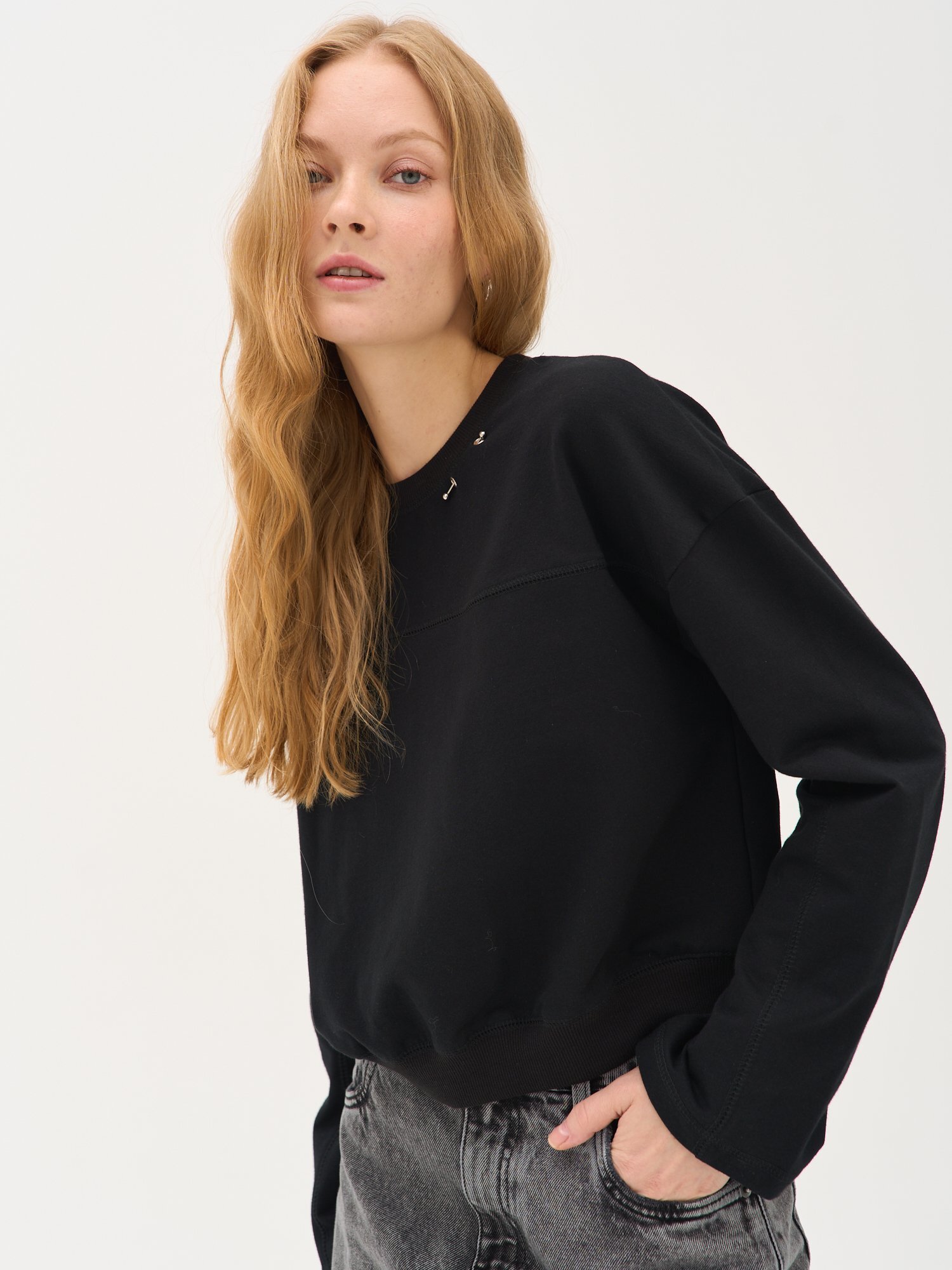Укороченный свитшот среднего объема из футера двухнитки. Декоративные строчки и акцентный элемент возле горловины – два люверса и маленькая металлическая штанга. По низу утяжка на резинку, плечо чуть спущенное.