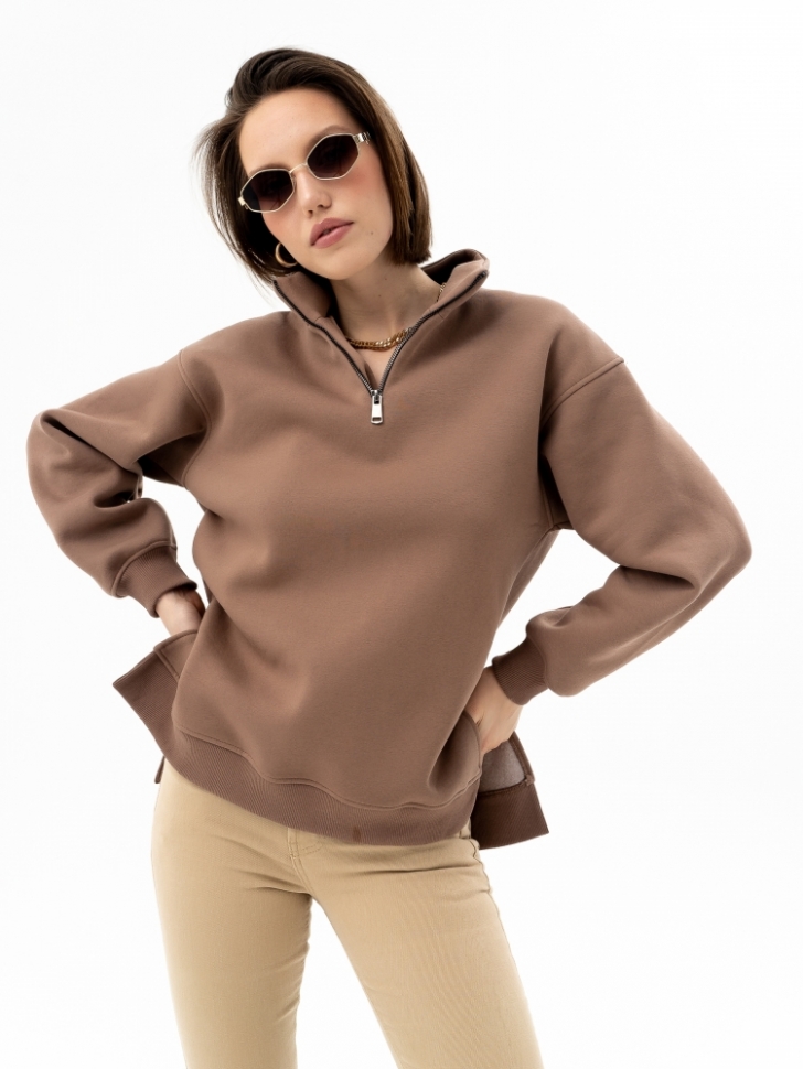 Свитшот с горловиной на молнии и стильными боковыми разрезами - незаменимая вещь в гардеробе каждой модницы. Выполненный из мягкого теплого материала с начесом, он идеально подходит для прохладной погоды и обеспечивает максимальный комфорт. Благодаря универсальному дизайну, этот свитшот легко сочетается с различными элементами гардероба. Носите его с любимыми джинсами или леггинсами, а также с более формальной одеждой, такой как юбка или брюки. В любом случае, вы будете выглядеть стильно и модно. Этот свитшот подходит для любой обуви, от кроссовок до высоких каблуков. Не упустите возможность обновить свой гардероб с помощью этого стильного и практичного свитшота! Рост модели на фото 175 см. Параметры модели: 84-60-92. Размер изделия на модели: 44-46. Материал: футер 3-х нитка начес (хлопок 80%, пэ 20%).