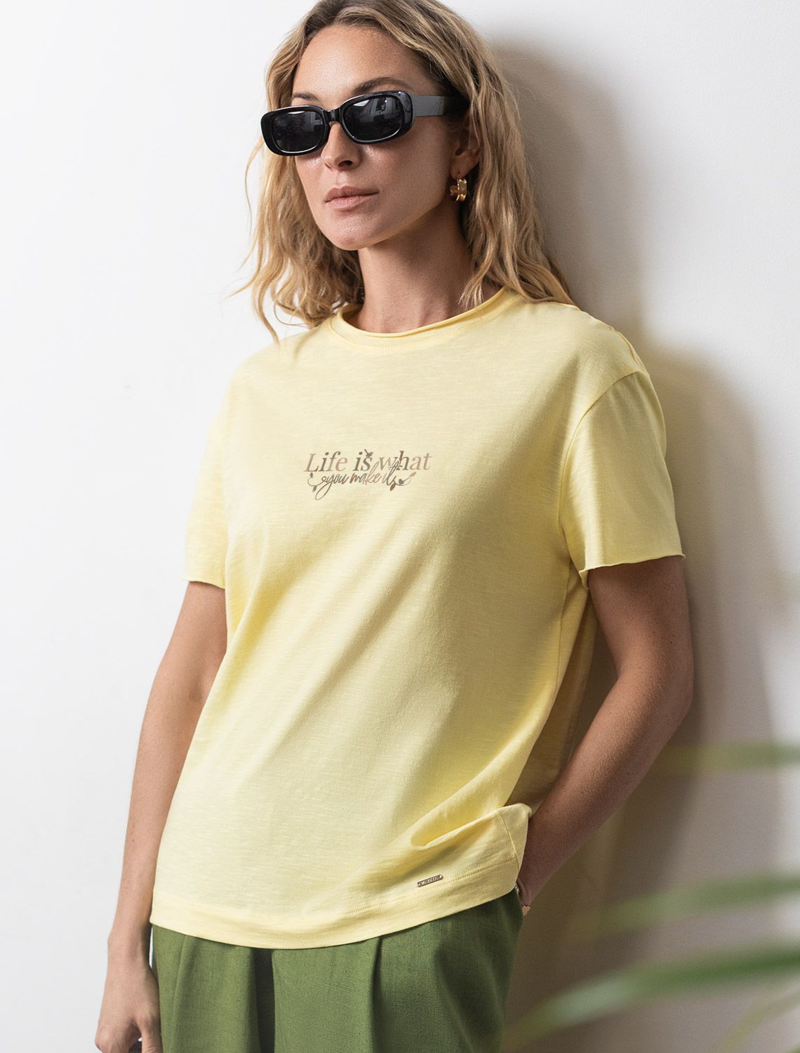 Свободная футболка бананового цвета выполнена из фактурного трикотажа плотностью 140 Г/м2. Текстура материала создает интересный эффект с характерными горизонтальными "штрихами", создаваемыми использованием нитей разной плотности, что делает повседненую футболку особенно стильной, при этом она идеальна для жаркой летней погоды и позволяет чувствовать легкость и удобство. Футболка прямого кроя отлично садится на любую фигуру, обеспечивая свободу движений. Дышащая ткань из натурального 100% хлопка пропускает воздух и не вызывает дискомфорта при длительном ношении. Модная футболка с принтом добавляет яркости образу, сохраняя баланс между минимализмом и выразительностью. Принт в виде надписи нанесен красками с устойчивым покрытием. Перевод надписи:Llife is what you make - Жизнь — это то, что ты из неё создаёшь. Базовая футболка хорошо держит форму и гарантирует долговечность даже при частой носке. Подходит для больших размеров до 56 включительно, свободная посадка позволяет чувствовать себя уверенно в любой ситуации. Это выбор для тех, кто ценит удобство без ущерба стилю. Мягкость материала делает футболку подходящей даже для беременных женщин или обладательниц чувствительной кожи. Актуальные цвета подчеркивают современность футболки, делая ее отличным вариантом как для повседневной носки, так и более праздничных случаев. Круглый вырез горловины дополняет общий минималистичный дизайн футболки, создавая аккуратный силуэт. Такой фасон уместен для работы в офисе, для городского стиля, дома, в неформальной обстановке или даже на деловых встречах.