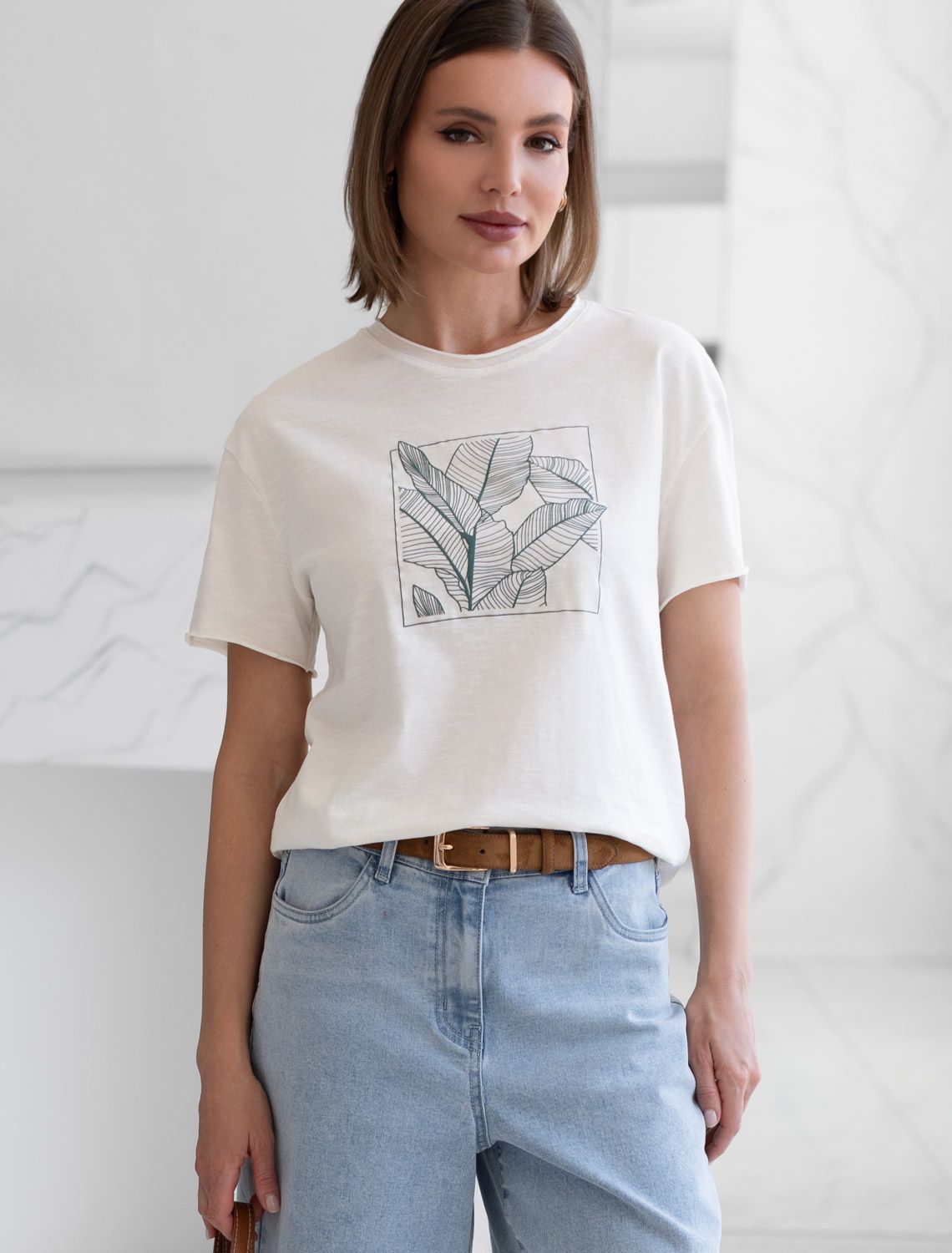Свободная футболка с принтом из фактурного 100% хлопка флам D49.163 молочный_листья