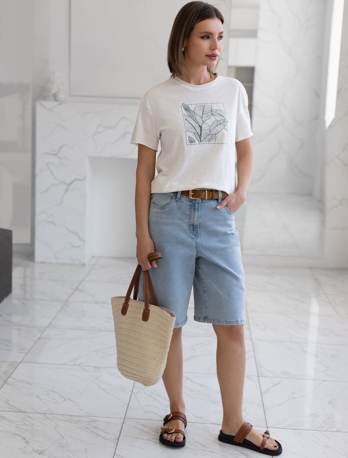 Свободная футболка молочного цвета выполнена из фактурного трикотажа плотностью 140 Г/м2. Текстура материала создает интересный эффект с характерными горизонтальными "штрихами", создаваемыми использованием нитей разной плотности, что делает повседненую футболку особенно стильной, при этом она идеальна для жаркой летней погоды и позволяет чувствовать легкость и удобство. Футболка прямого кроя отлично садится на любую фигуру, обеспечивая свободу движений. Дышащая ткань из натурального 100% хлопка пропускает воздух и не вызывает дискомфорта при длительном ношении. Модная футболка с принтом добавляет яркости образу, сохраняя баланс между минимализмом и выразительностью. Принт в виде листьев нанесен красками с устойчивым покрытием. Базовая футболка хорошо держит форму и гарантирует долговечность даже при частой носке. Подходит для больших размеров до 56 включительно, свободная посадка позволяет чувствовать себя уверенно в любой ситуации. Это выбор для тех, кто ценит удобство без ущерба стилю. Мягкость материала делает футболку подходящей даже для беременных женщин или обладательниц чувствительной кожи. Актуальные цвета подчеркивают современность футболки, делая ее отличным вариантом как для повседневной носки, так и более праздничных случаев. Круглый вырез горловины дополняет общий минималистичный дизайн футболки, создавая аккуратный силуэт. Такой фасон уместен для работы в офисе, для городского стиля, дома, в неформальной обстановке или даже на деловых встречах.