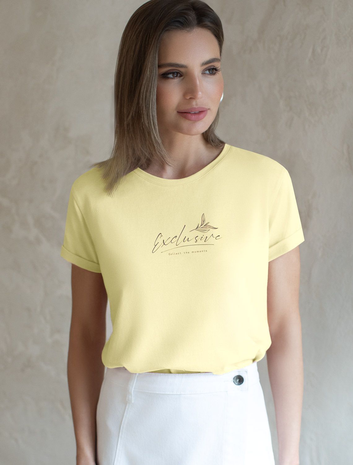 Модная футболка лимонного цвета привлекает внимание своим интересным дизайном и ярким принтом. Благодаря прямому крою изделие комфортно садится на любую фигуру, в том числе на большие размеры, и не сковывает движений. Круглый вырез подчеркивает современный стиль, а натуральный материал из хлопка с добавлением эластана обеспечивает удобство в повседневной носке и приятные тактильные ощущения. Прочность и износостойкая структура сохраняет первоначальную форму футболки после множества стирок. Рукава имеют аккуратные подгибы, что придает изделию завершенность и помогает сохранять аккуратный внешний вид. Принт надписи нанесен красками с устойчивым покрытием, перевод надписи: Exluzive moments collection only - Только коллекция эксклюзивных моментов. Стильная футболка гармонично вписывается в любой гардероб и подойдет для прогулок, отдыха дома или неформальных встреч. Благодаря особенностям кроя модель хорошо сидит, скрывая недостатки и подчеркивая достоинства. Удобная футболка идеально сочетается с базовыми вещами, позволяя создавать новые интересные образы каждый день.