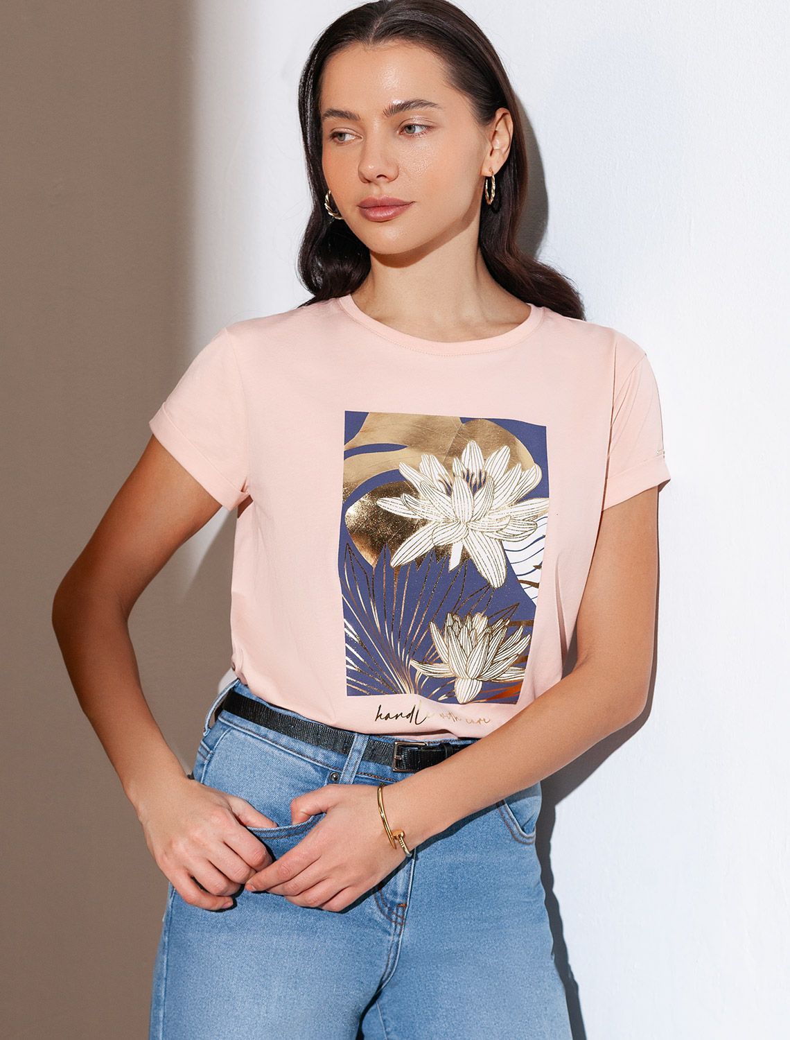 Модная футболка пудрового цвета привлекает внимание своим интересным дизайном и ярким принтом. Благодаря прямому крою изделие комфортно садится на любую фигуру, в том числе на большие размеры, и не сковывает движений. Круглый вырез подчеркивает современный стиль, а натуральный материал из хлопка с добавлением эластана обеспечивает удобство в повседневной носке и приятные тактильные ощущения. Прочность и износостойкая структура сохраняет первоначальную форму футболки после множества стирок. Рукава имеют аккуратные подгибы, что придает изделию завершенность и помогает сохранять аккуратный внешний вид. Принт в виде цветов и надписи нанесен красками с устойчивым покрытием, перевод надписи: Handle with care - Обращаться с осторожностью. Стильная футболка гармонично вписывается в любой гардероб и подойдет для прогулок, отдыха дома или неформальных встреч. Благодаря особенностям кроя модель хорошо сидит, скрывая недостатки и подчеркивая достоинства. Удобная футболка идеально сочетается с базовыми вещами, позволяя создавать новые интересные образы каждый день.