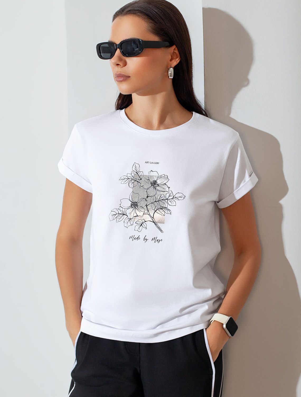 Модная футболка белого цвета привлекает внимание своим интересным дизайном и ярким принтом. Благодаря прямому крою изделие комфортно садится на любую фигуру, в том числе на большие размеры, и не сковывает движений. Круглый вырез подчеркивает современный стиль, а натуральный материал из хлопка с добавлением эластана обеспечивает удобство в повседневной носке и приятные тактильные ощущения. Прочность и износостойкая структура сохраняет первоначальную форму футболки после множества стирок. Рукава имеют аккуратные подгибы, что придает изделию завершенность и помогает сохранять аккуратный внешний вид. Принт в виде цветов и надписи нанесен красками с устойчивым покрытием, перевод надписи: Art gallery made by muse - Художественная галерея, созданная музой. Стильная футболка гармонично вписывается в любой гардероб и подойдет для прогулок, отдыха дома или неформальных встреч. Благодаря особенностям кроя модель хорошо сидит, скрывая недостатки и подчеркивая достоинства. Удобная футболка идеально сочетается с базовыми вещами, позволяя создавать новые интересные образы каждый день.