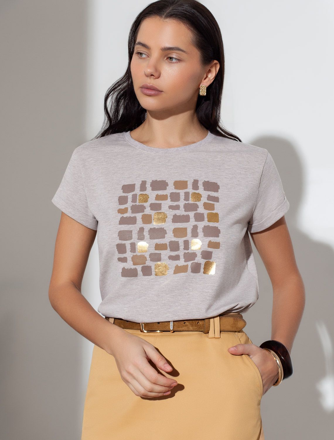 Модная футболка кофейного цвета привлекает внимание своим интересным дизайном и ярким принтом. Благодаря прямому крою изделие комфортно садится на любую фигуру, в том числе на большие размеры, и не сковывает движений. Круглый вырез подчеркивает современный стиль, а натуральный материал из хлопка с добавлением эластана обеспечивает удобство в повседневной носке и приятные тактильные ощущения. Прочность и износостойкая структура сохраняет первоначальную форму футболки после множества стирок. Рукава имеют аккуратные подгибы, что придает изделию завершенность и помогает сохранять аккуратный внешний вид. Принт в виде бликов нанесен золотистыми красками с устойчивым покрытием. Стильная футболка гармонично вписывается в любой гардероб и подойдет для прогулок, отдыха дома или неформальных встреч. Благодаря особенностям кроя модель хорошо сидит, скрывая недостатки и подчеркивая достоинства. Удобная футболка идеально сочетается с базовыми вещами, позволяя создавать новые интересные образы каждый день.