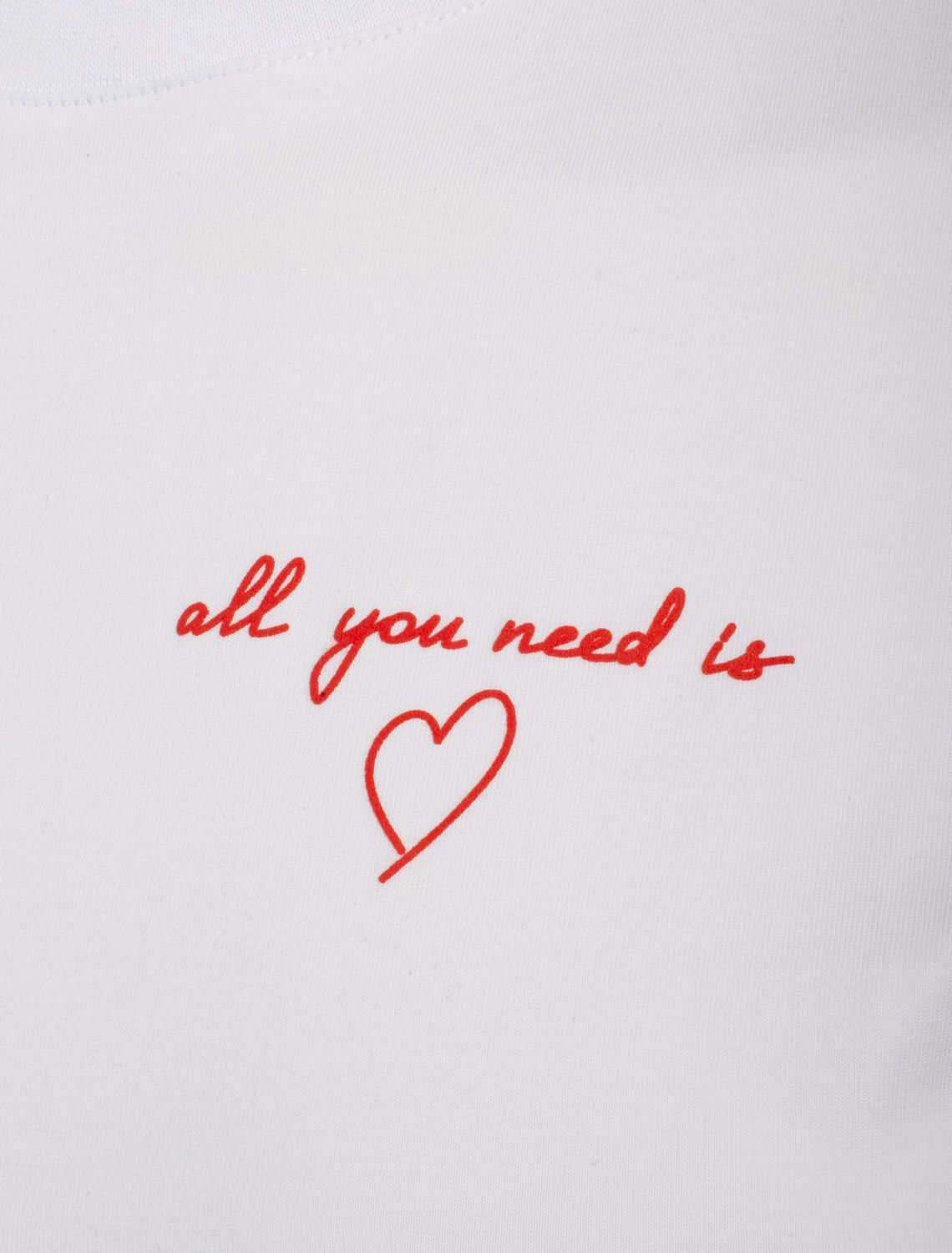 Модная футболка белого цвета привлекает внимание своим интересным дизайном и ярким принтом. Благодаря прямому крою изделие комфортно садится на любую фигуру, в том числе на большие размеры, и не сковывает движений. Круглый вырез подчеркивает современный стиль, а натуральный материал из хлопка с добавлением эластана обеспечивает удобство в повседневной носке и приятные тактильные ощущения. Прочность и износостойкая структура позволяют сохранять свежий внешний вид после множества стирок. Принт в виде надписи и сердца нанесен красками с устойчивым покрытием, перевод надписи: Al you need is love- Все, что вам нужно это любовь. Стильная футболка гармонично вписывается в любой гардероб и подойдет для прогулок, отдыха или неформальных встреч. Благодаря особенностям кроя модель хорошо сидит, скрывая недостатки и подчеркивая достоинства. Яркая футболка идеально сочетается с базовыми вещами, позволяя создавать новые интересные образы каждый день.