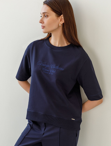 Свободная футболка темно-синего цвета с V-вырезом и цельнокроеным рукавом из натурального 100% хлопка создает красивый и легкий образ для дома и отдыха. Дышащая ткань бережно заботится о коже, в то время как декольте с V-вырезом утонченно подчеркивает линию шеи, а свободный крой скрывает возможные недостатки фигуры. Такая футболка отлично подойдет для тех, кто ценит комфорт и стиль одновременно. Благодаря натуральной хлопковой ткани, она идеально подходит для ежедневного использования, обеспечивая чувство легкости и свободы движений. Легкая структура материала поддерживает оптимальный микроклимат, что важно при длительном использовании. Эта футболка женственно смотрится и дарит ощущение уюта, делая ее необходимым элементом домашнего гардероба.