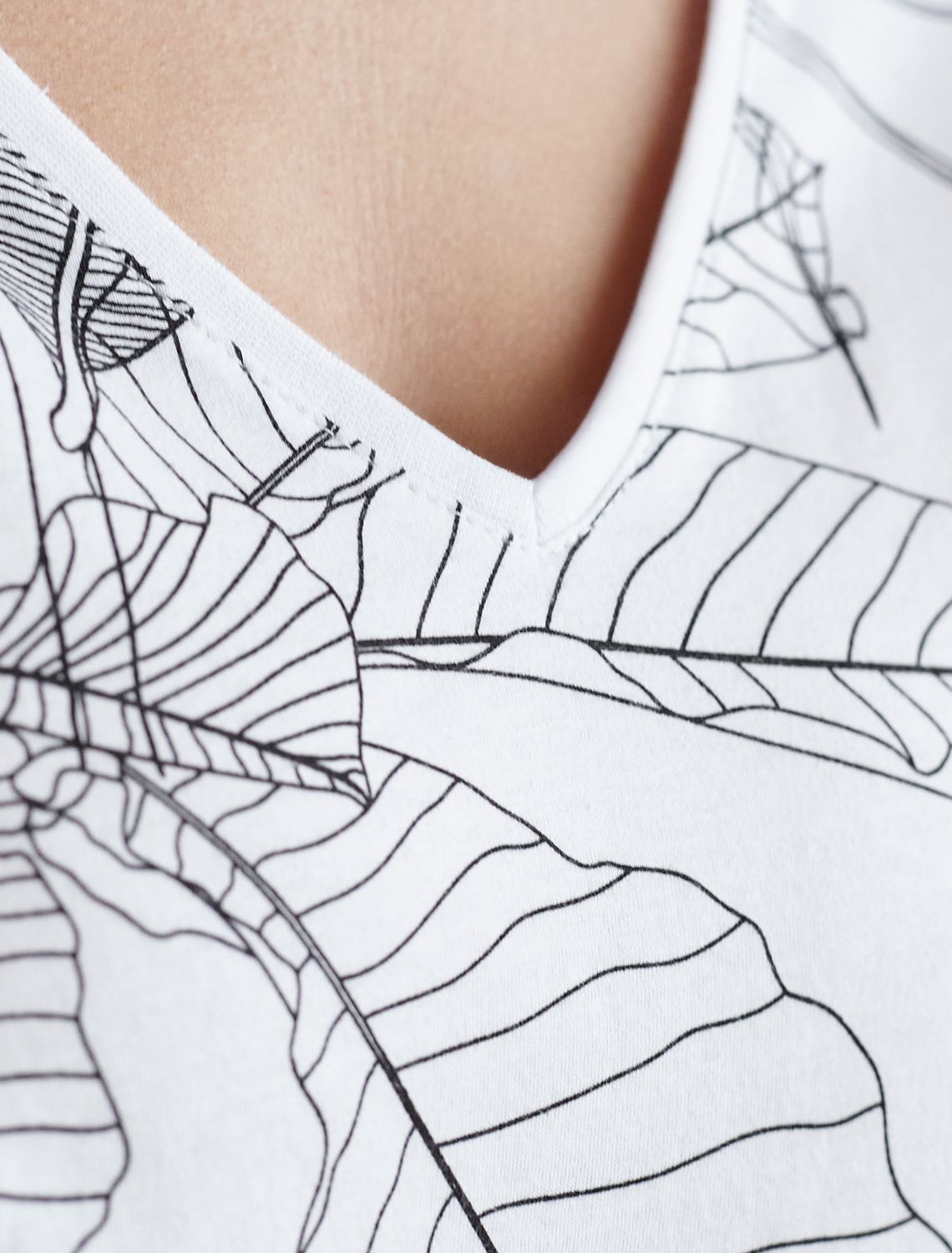 Свободная футболка белого цвета с V-вырезом и цельнокроеным рукавом из натурального 100% хлопка создает красивый и легкий образ для дома и отдыха. Дышащая ткань бережно заботится о коже, в то время как декольте с V-вырезом утонченно подчеркивает линию шеи, а свободный крой скрывает возможные недостатки фигуры. Принт в виде листьев добавляет повседневной футболке оригинальности и актуальности для любой домашней обстановки. Такая футболка отлично подойдет для тех, кто ценит комфорт и стиль одновременно. Благодаря натуральной хлопковой ткани, она идеально подходит для ежедневного использования, обеспечивая чувство легкости и свободы движений. Легкая структура материала поддерживает оптимальный микроклимат, что важно при длительном использовании. Эта футболка женственно смотрится и дарит ощущение уюта, делая ее необходимым элементом домашнего гардероба.