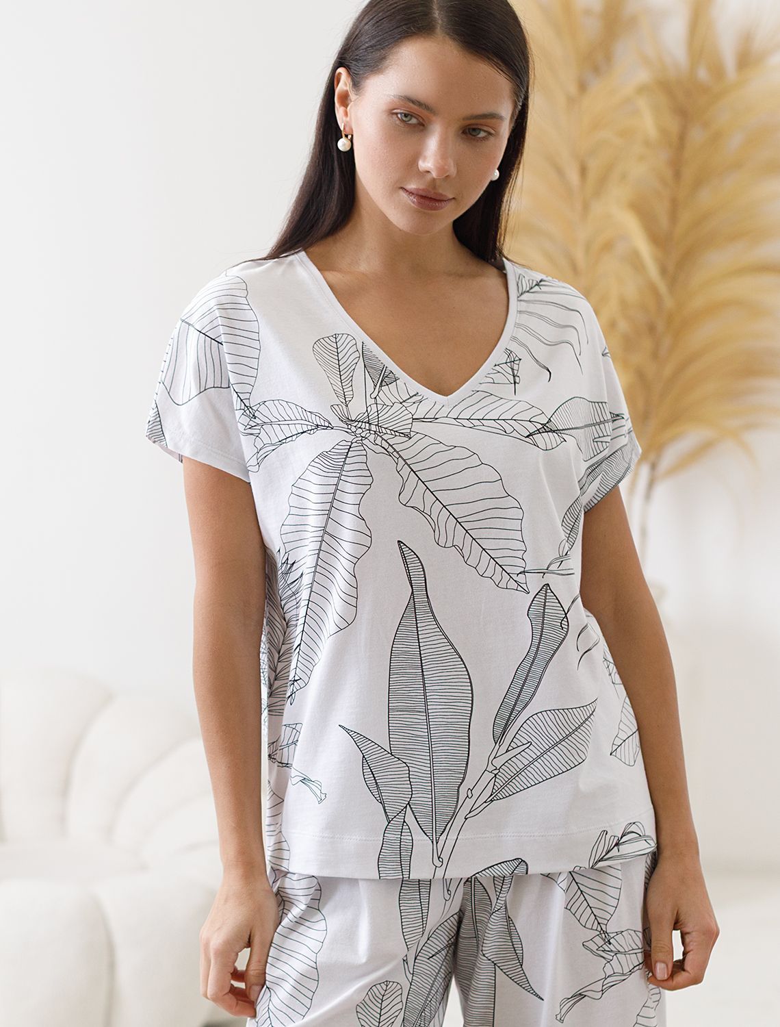 Свободная футболка с V-вырезом и цельнокроеным рукавом из 100% хлопка с принтом D49.153 белый-черный листья
