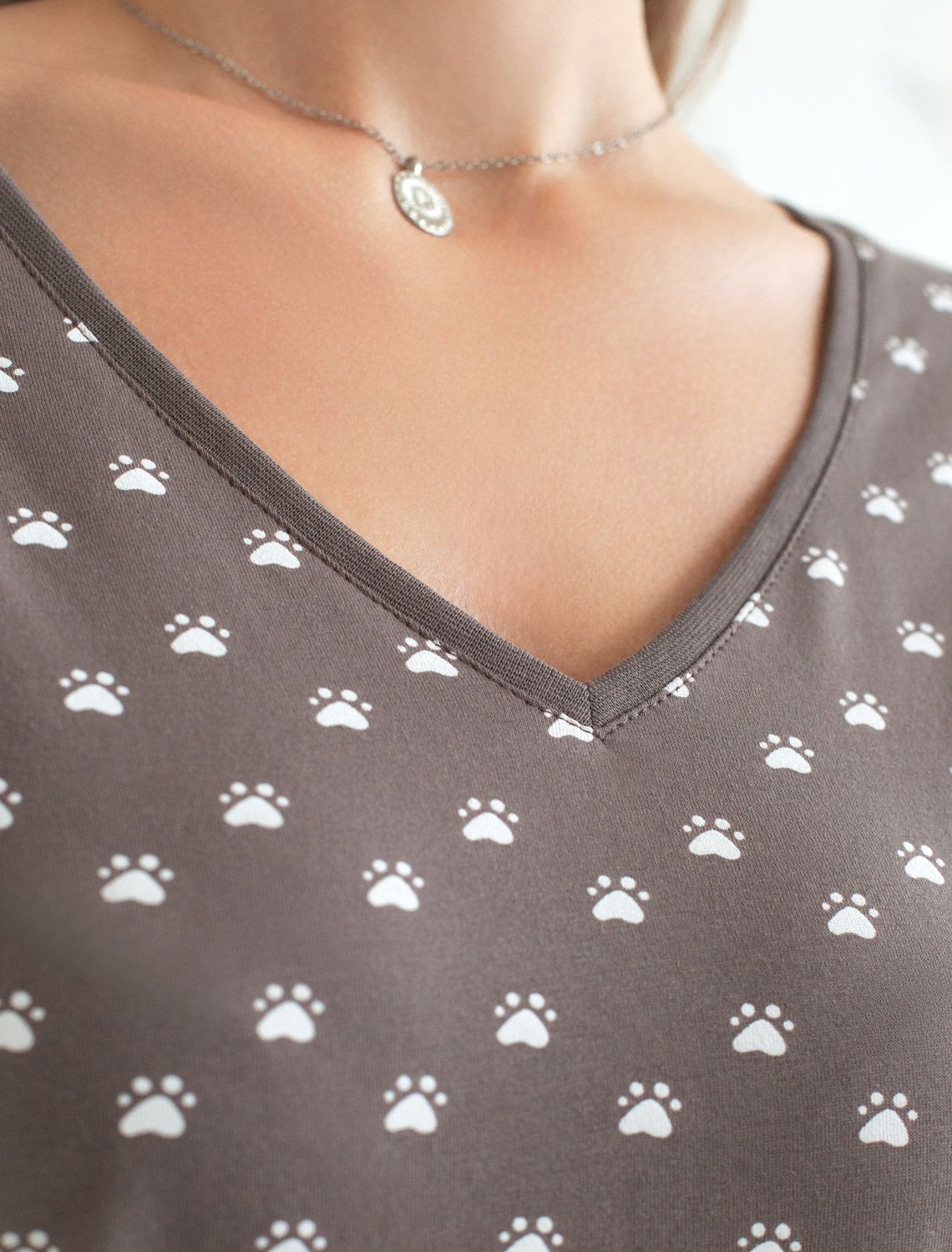 Свободная футболка с V-вырезом и цельнокроеным рукавом из 100% хлопка с принтом D49.153 кофе-белый лапы