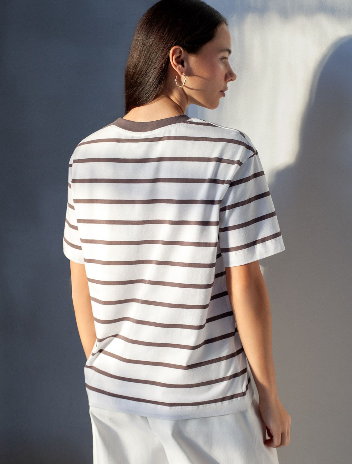 Свободная футболка в широкую полоску с принтом из премиального хлопка с эластаном D49.145 белый-кофе_vilatte