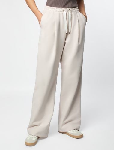 Брюки свободного кроя выполнены из эластичного футера-двухнитки. Модель дополнена защипами и боковыми карманами как у классических брюк и одним задним карманом. Эластичный пояс на резинке с шнурком из репсовой ленты и металлической фурнитурой. Брюки сочетаются в костюме с футболкой D49.085