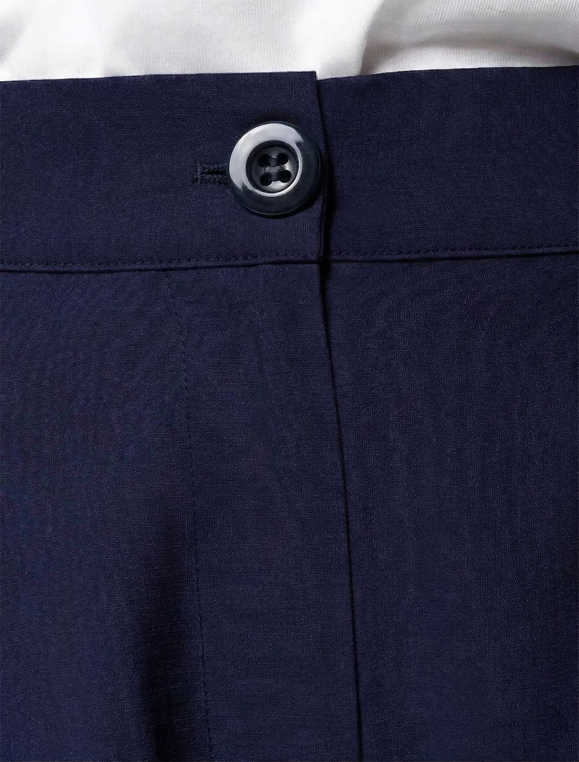 Брюки темно-синего цвета свободного кроя выполнены из плотного лиоцелла. Лиоцелл это более дорогой и экологичный вариант вискозы, очень прочный и шелковистый. Свободные прямые брюки с высокой посадкой визуально вытягивают силуэт и стройнят. Эластичный пояс на мягкой резинке гарантирует комфорт в талии и отлично сядет на любую фигуру. Удобные карманы по бокам и свободный крой делают эти брюки базовым элементом гардероба. Летние брюки отлично сочетаются с монохромным верхом, с ними можно создавать эффектные наряды как на выход, так и для ежедневных рабочих дел или простых прогулок, от делового шика до повседневного кэжуал.