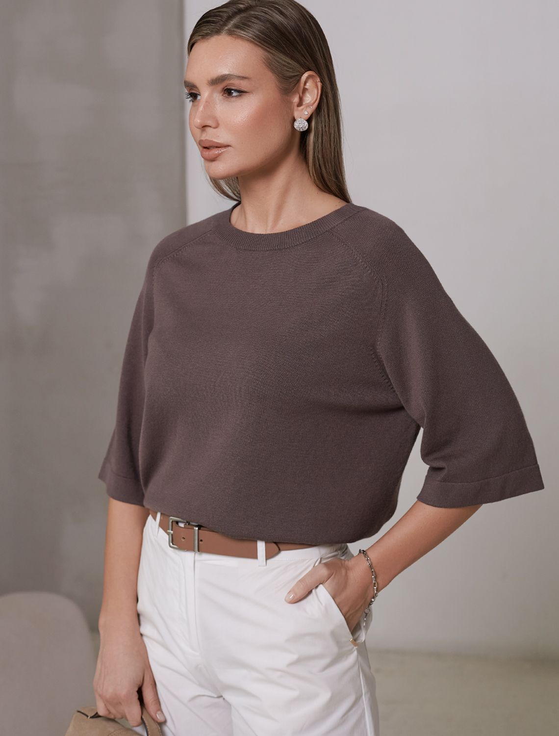 Состав: 80%Вис 20%ПАЛегкий свободный джемпер кофейного цвета с круглым вырезом идеально подходит на весну и лето. Тонкая вязка из вискозы дарит приятный комфорт и ощущение свежести в теплую погоду. Универсальная длина позволяет сочетать джемпер с разными элементами гардероба. Джемпер отлично смотрится на больших размерах благодаря продуманному крою и свободному фасону. Широкие рукава создают воздушность и делают силуэт особенно женственным. Этот джемпер с рукавом 3/4 станет незаменимой частью гардероба в сезоны, когда хочется легкости и элегантности одновременно. Лаконичный дизайн обеспечивает простоту комбинирования с другими вещами и будет универсальной базой для создания разнообразных комплектов — от офисного до непринужденного городского стиля.