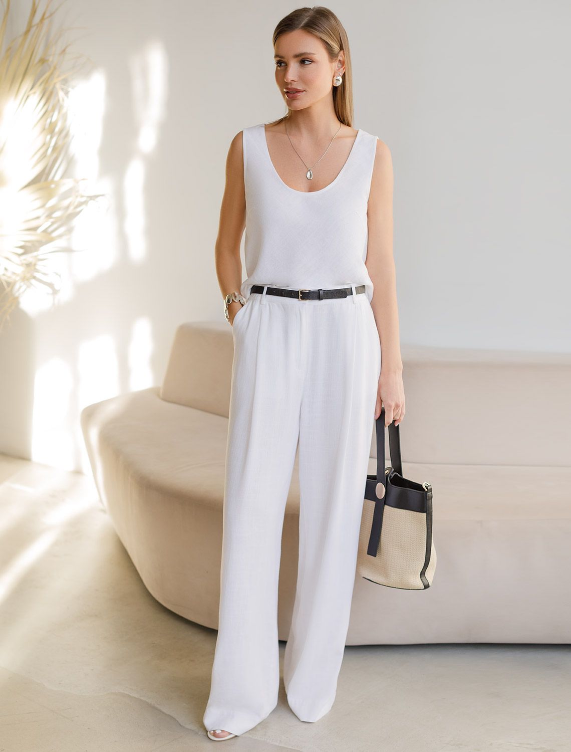 Лаконичный топ белого цвета без застежек с U-вырезом выполнен изо льна с вискозой, плотносью 200 Г/м2. Сочетание льна и вискозы обеспечивает комфорт и прохладу в жаркие дни. Свободный топ на широких бретелях будет идеальным выбором для лета и весны, позволяя ощущать комфорт даже при высокой температуре воздуха. Особенность этого летнего топа — шитый по косой, он хорошо драпируется и мягко прилегает к фигуре, создавая струящиеся складки. Свободный крой топа обеспечивает комфорт, легкость и свободу движений, открытое декольте подчеркивает изысканность образа и женственность силуэта. Этот красивый топ подойдет для создания любого стильного повседневного образа, на работу или на важное мероприятие.
