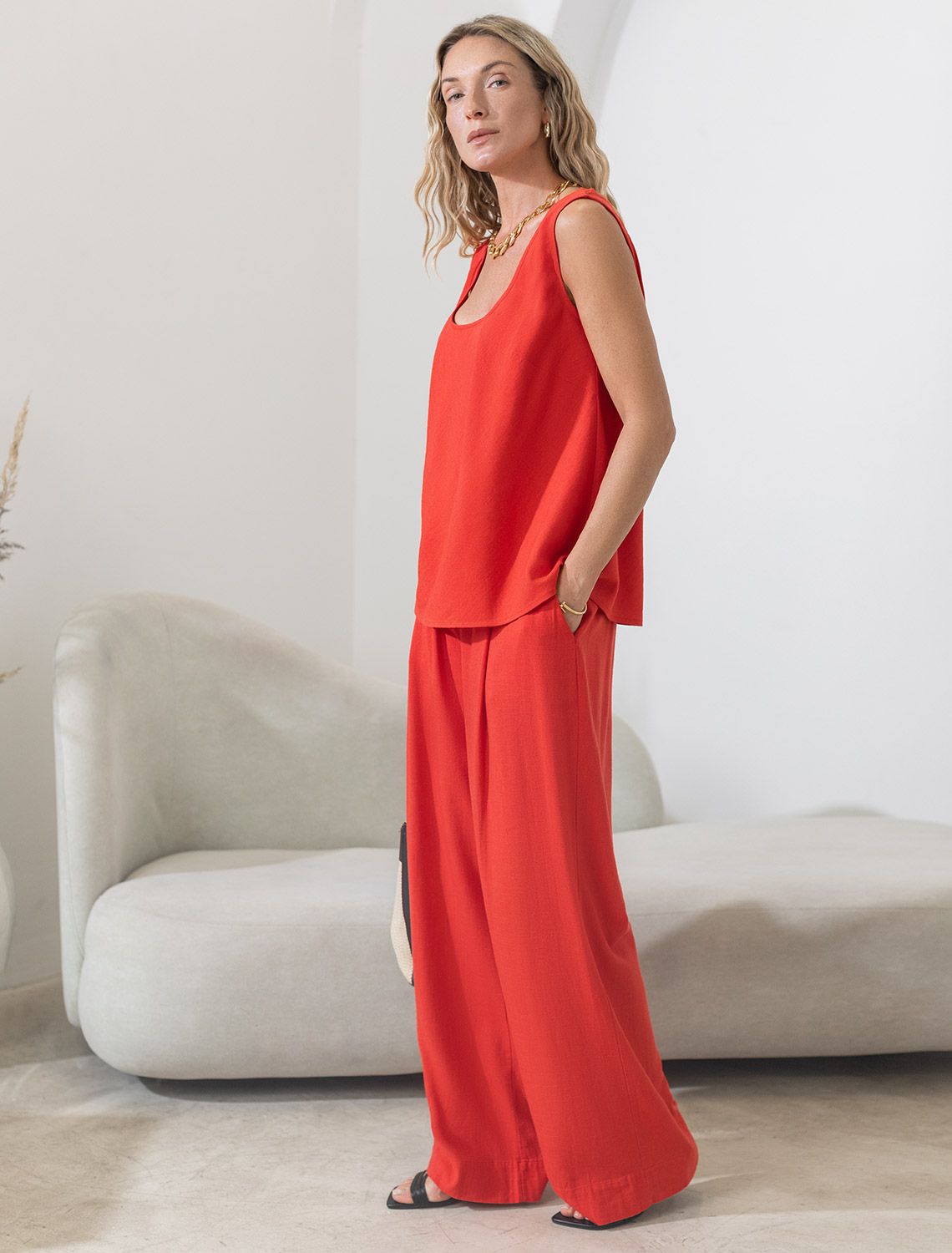 Лаконичный топ кораллового цвета без застежек с U-вырезом выполнен изо льна с вискозой, плотносью 200 Г/м2. Сочетание льна и вискозы обеспечивает комфорт и прохладу в жаркие дни. Свободный топ на широких бретелях будет идеальным выбором для лета и весны, позволяя ощущать комфорт даже при высокой температуре воздуха. Особенность этого летнего топа — шитый по косой, он хорошо драпируется и мягко прилегает к фигуре, создавая струящиеся складки. Свободный крой топа обеспечивает комфорт, легкость и свободу движений, открытое декольте подчеркивает изысканность образа и женственность силуэта. Этот красивый топ подойдет для создания любого стильного повседневного образа, на работу или на важное мероприятие.
