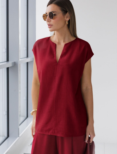 Свободный топ с U-вырезом изо льна с вискозой по косой D23.076 коралловый