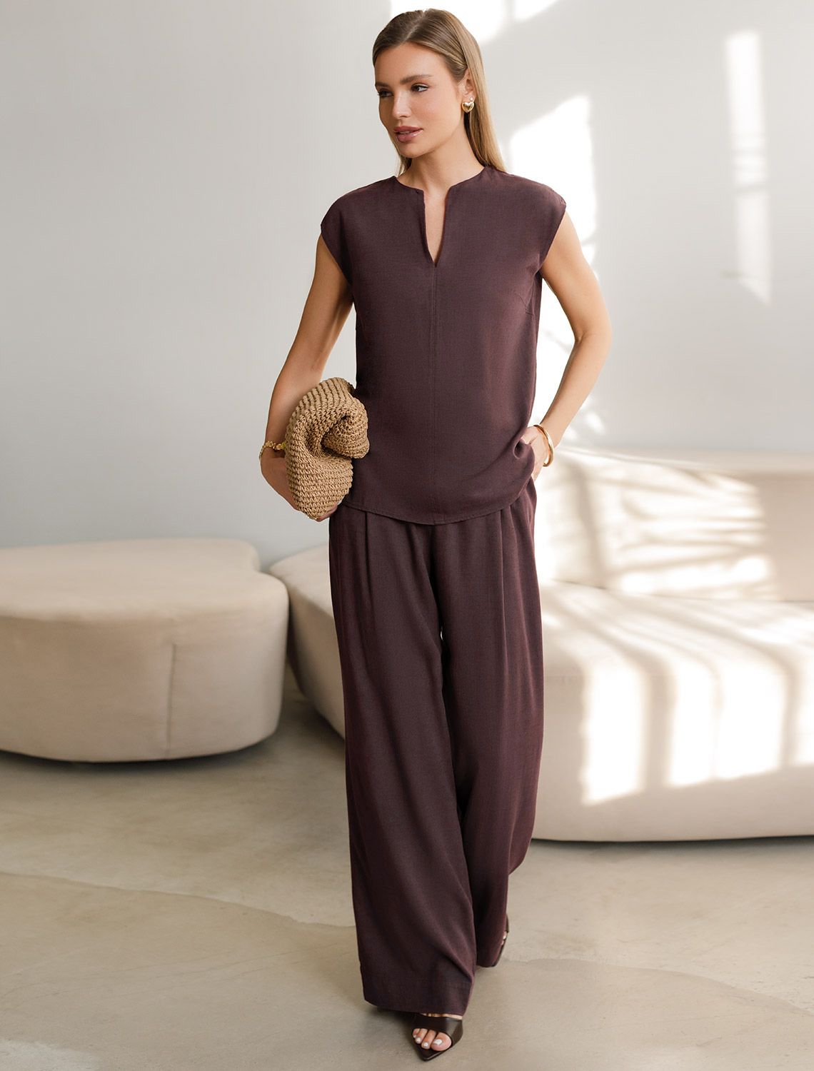 Лаконичный топ коричневого цвета без застежек с V-вырезом выполнен изо льна с вискозой, плотносью 200 Г/м2. Сочетание льна и вискозы обеспечивает комфорт и прохладу в жаркие дни. Свободный топ c коротким цельнокроеным рукавом будет идеальным выбором для лета и весны, позволяя ощущать комфорт даже при высокой температуре воздуха. Особенность этого летнего топа — натуральный материал, который хорошо драпируется и мягко прилегает к фигуре, создавая струящиеся складки. Свободный крой топа обеспечивает комфорт, легкость и свободу движений, аккуратное полузакрытое декольте подчеркивает изысканность образа и женственность силуэта. Этот красивый топ подойдет для создания любого стильного повседневного образа, на работу или на важное мероприятие.