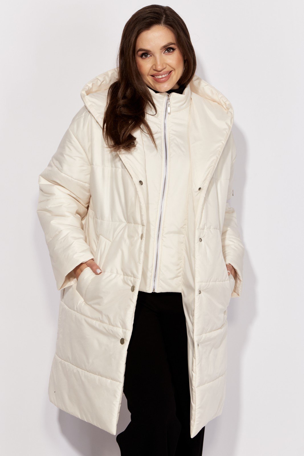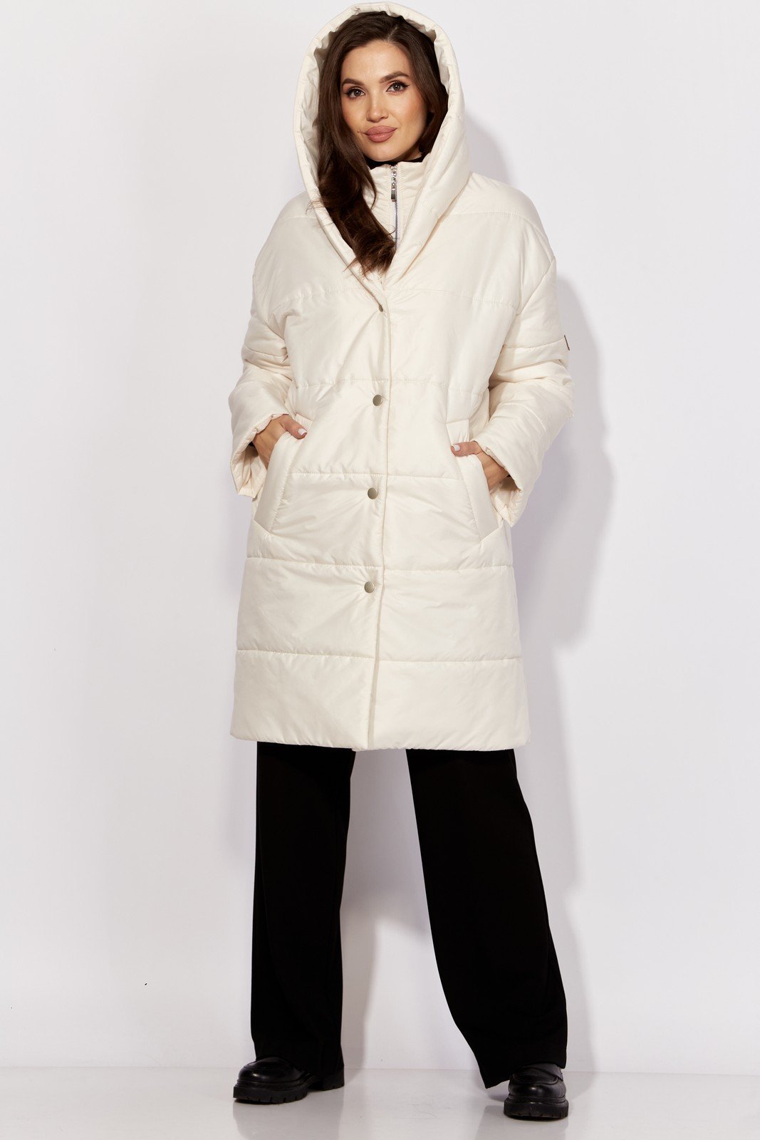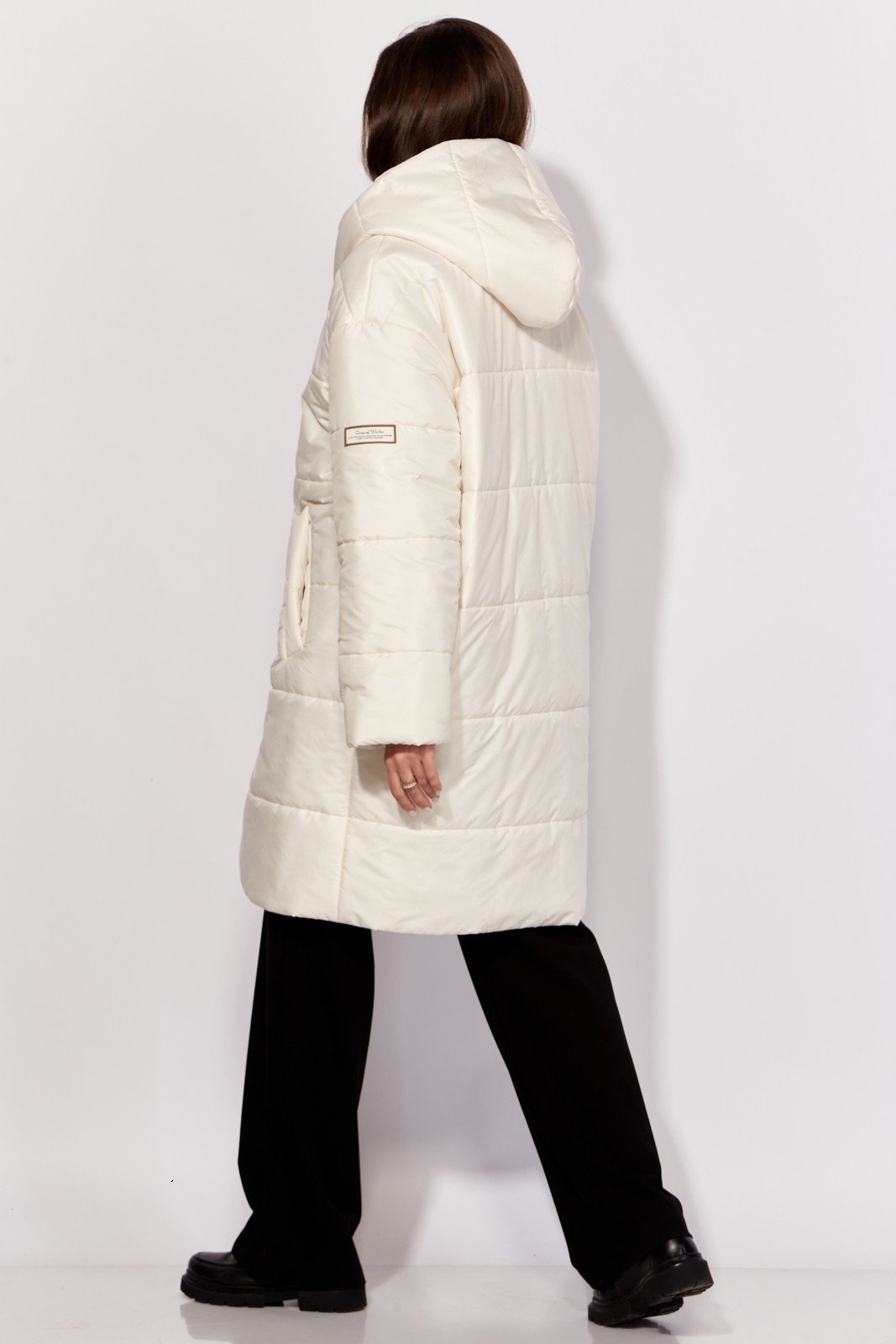Пальто женское, прямого силуэта, с длинным рукавом. Длину рукава можно регулировать отложной манжетой. На левом рукаве отделочная нашивка. Рукав со спущенной линией плеча. По переду карманы "листочки" Горловина оформлена капюшоном, с отрезными бортами. Застежка центральная , однобортная, на кнопки. По переду, втачная деталь с воротником стойка, имитация жилетки, с застежкой на тесьму "молния" Спинка без особенностей. Пальто на подкладке. Синтепон VS-200.