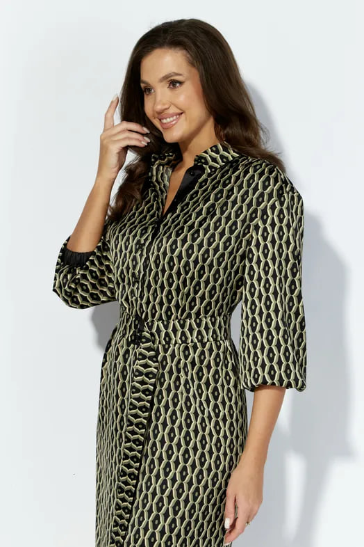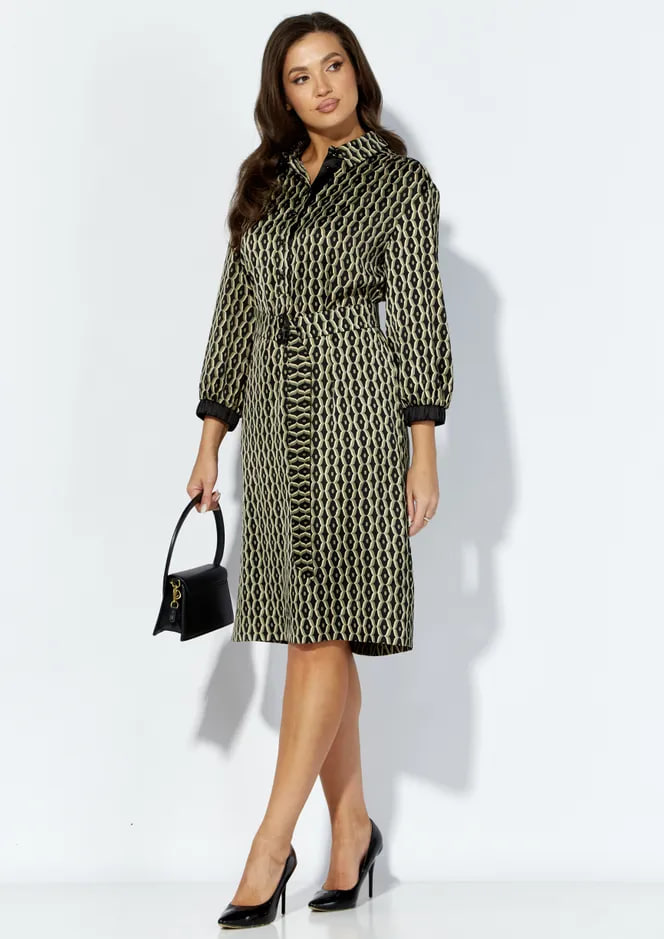 Платье женское, прямого силуэта с рукавом длинной 7/8. Рукав со спущенной линией плеча, по низу манжета с резинкой. Воротник рубашечный, на стойке. Застежка до линии талии, с отрезной планкой на петли и пуговицы. Из под кокеток переда и спинки-сборка. По боку платья, шлица. Линию талии подчеркивает съемный пояс с полукольцами