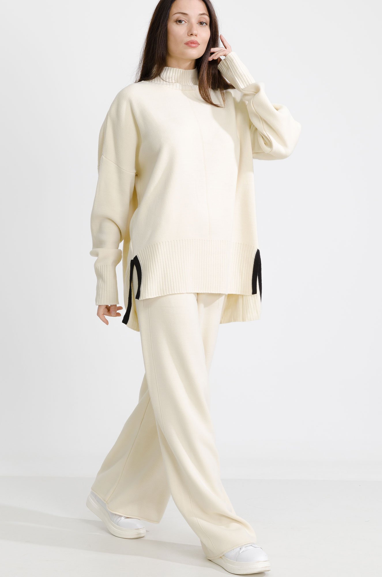 Черная оборка на изящных разрезах и небольшой воротник стойка приковывают внимание к свитеру. Удлиненная нижняя часть джемпера, рукава и горловина выполнены фактурным плетением в рубчик – интересный и стильный акцент.