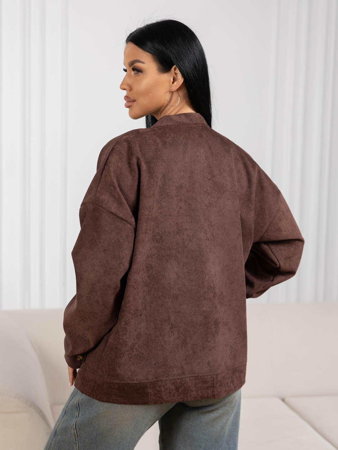 Бомбер из микровельвета, на пуговицах с большими накладными карманами, длинным рукавом и манжетой. Рост модели 165см.