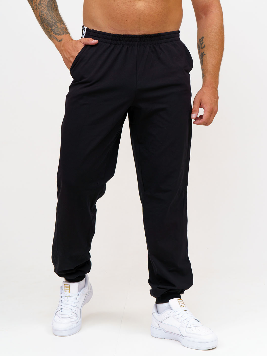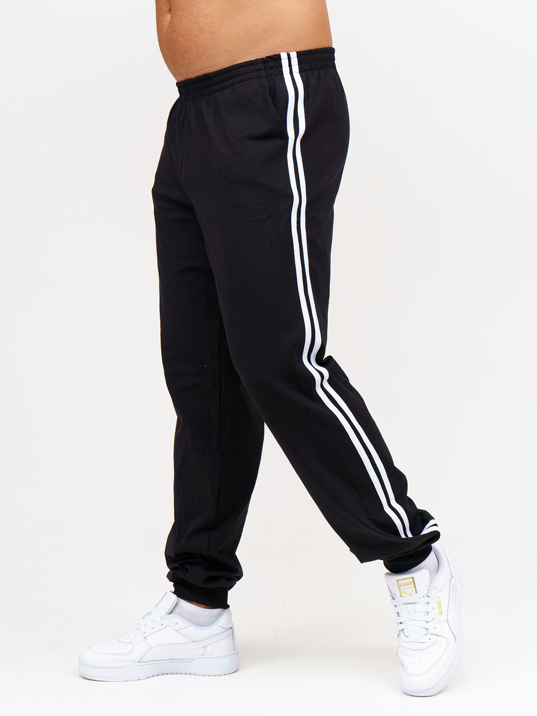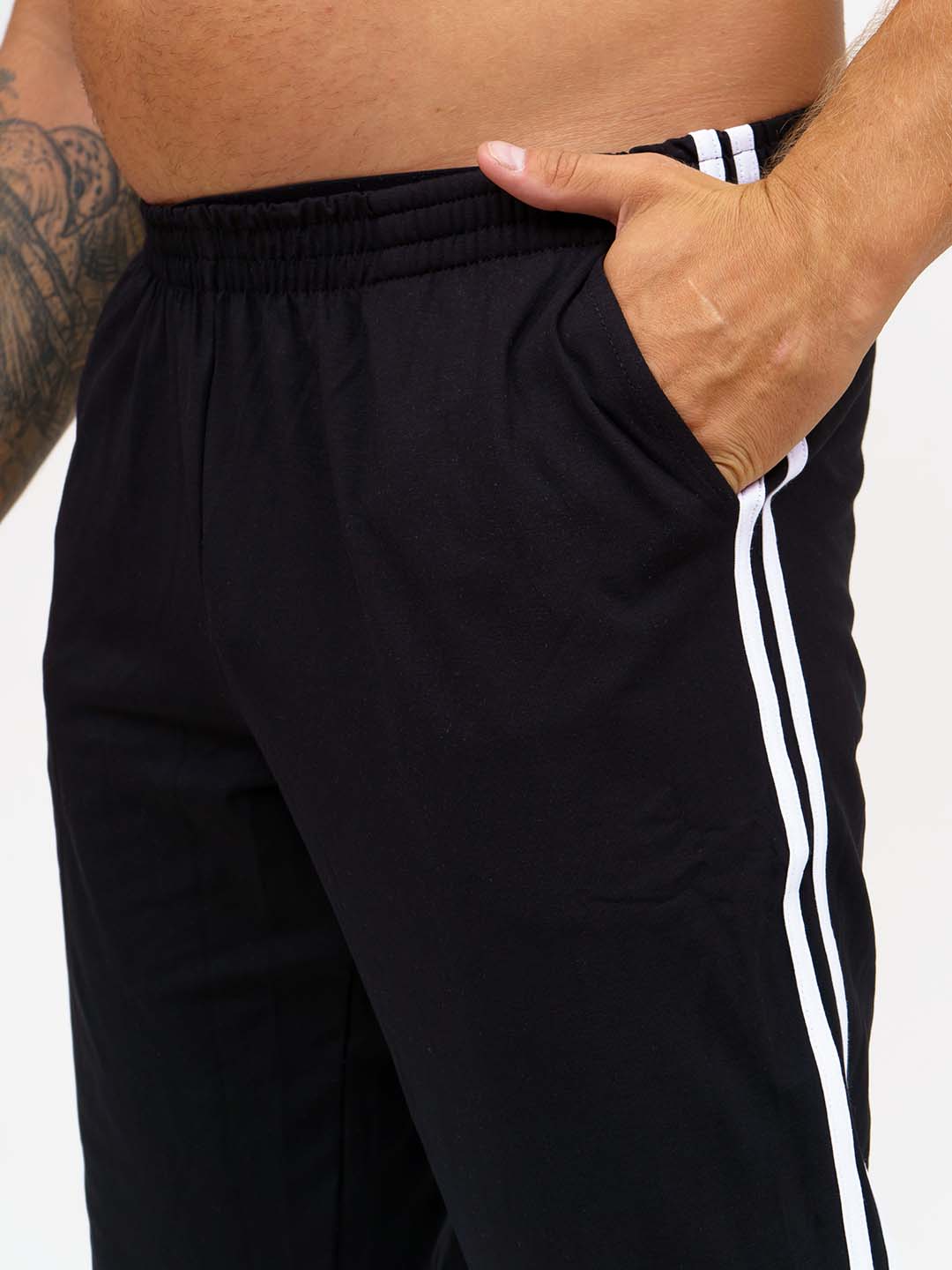 Брюки мужские спортивные полуприлегающего силуэта из трикотажного полотна кулирка с лайкрой. Верх брюк обработан цельнокроеным поясом на резинке. Низ брюк обработан манжетой. В изделии присутствуют лампасы в виде двух полосок по боковым швам, карманы в боковых швах. Брюки отлично подойдут как для дома, так и для активного отдыха на природе.
