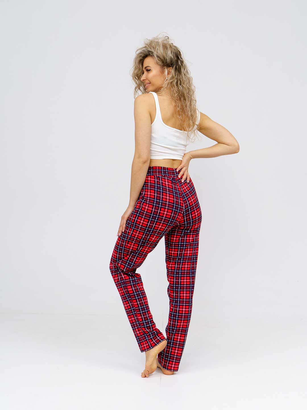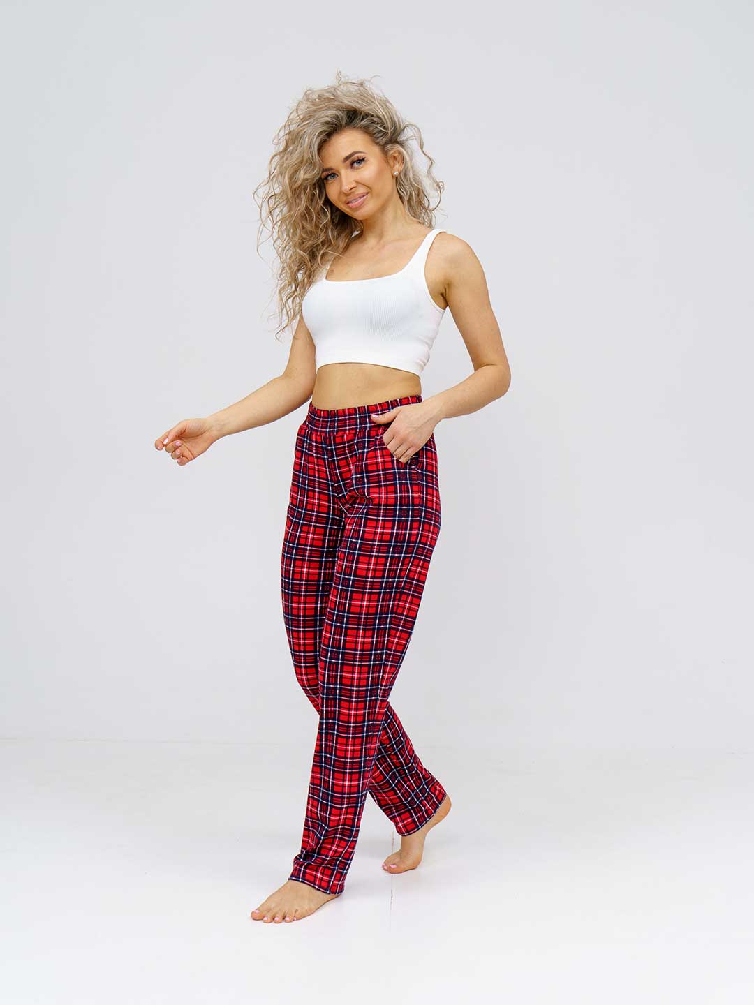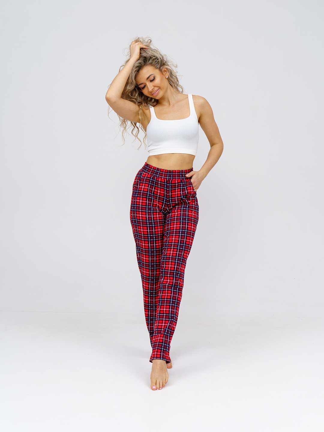 Трикотажные женские брюки для дома из 100% хлопка. Посадка средняя, пояс на резинке, полуприлегающего силуэта с карманами. Не стесняют движения и обеспечивают настоящий домашний комфорт и удобство.