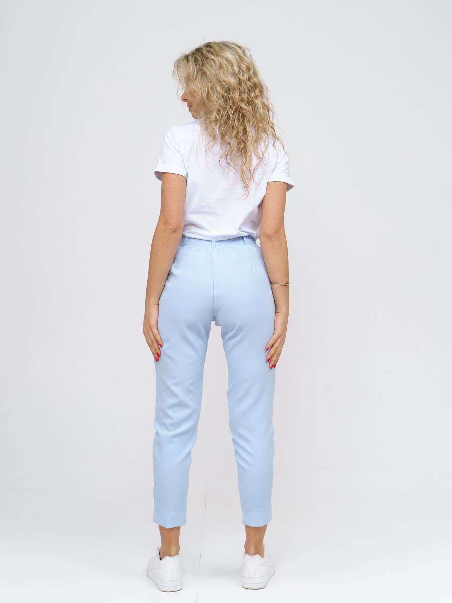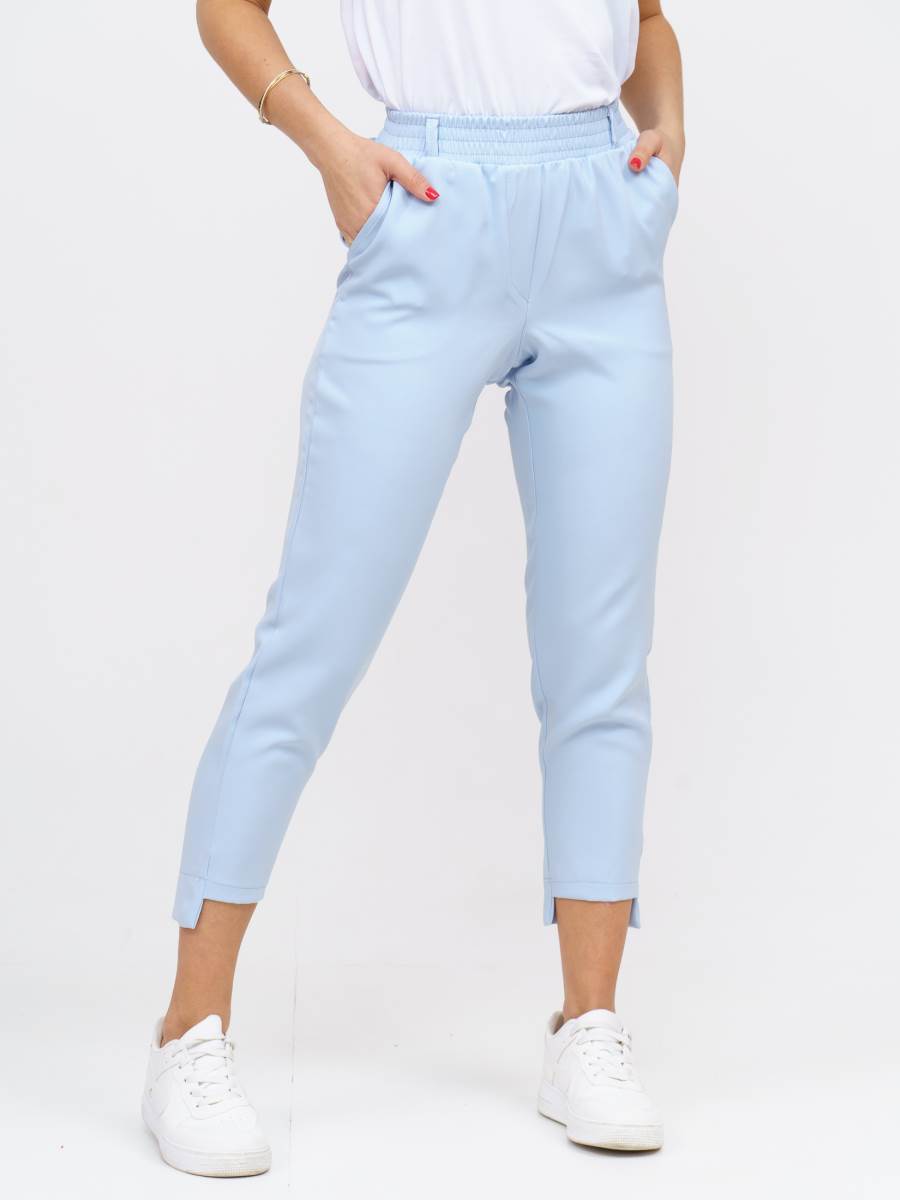 Брюки женские полуприлегающего силуэта, с асимметричным низом. Спереди брюк есть карманы, верхний срез обработан поясом на резинке.