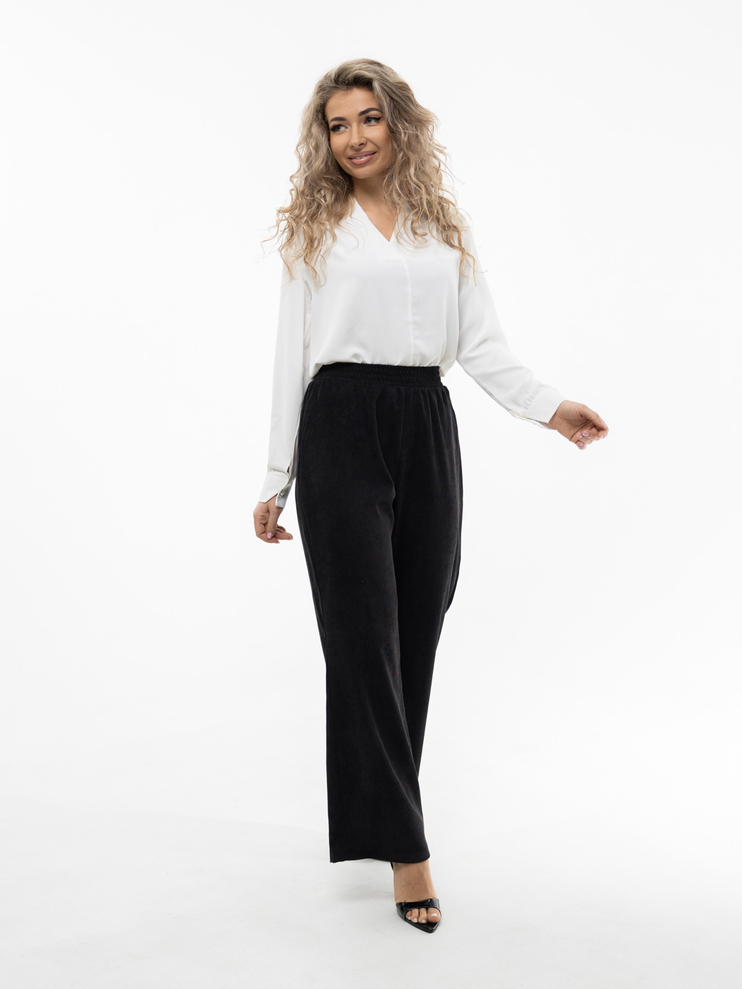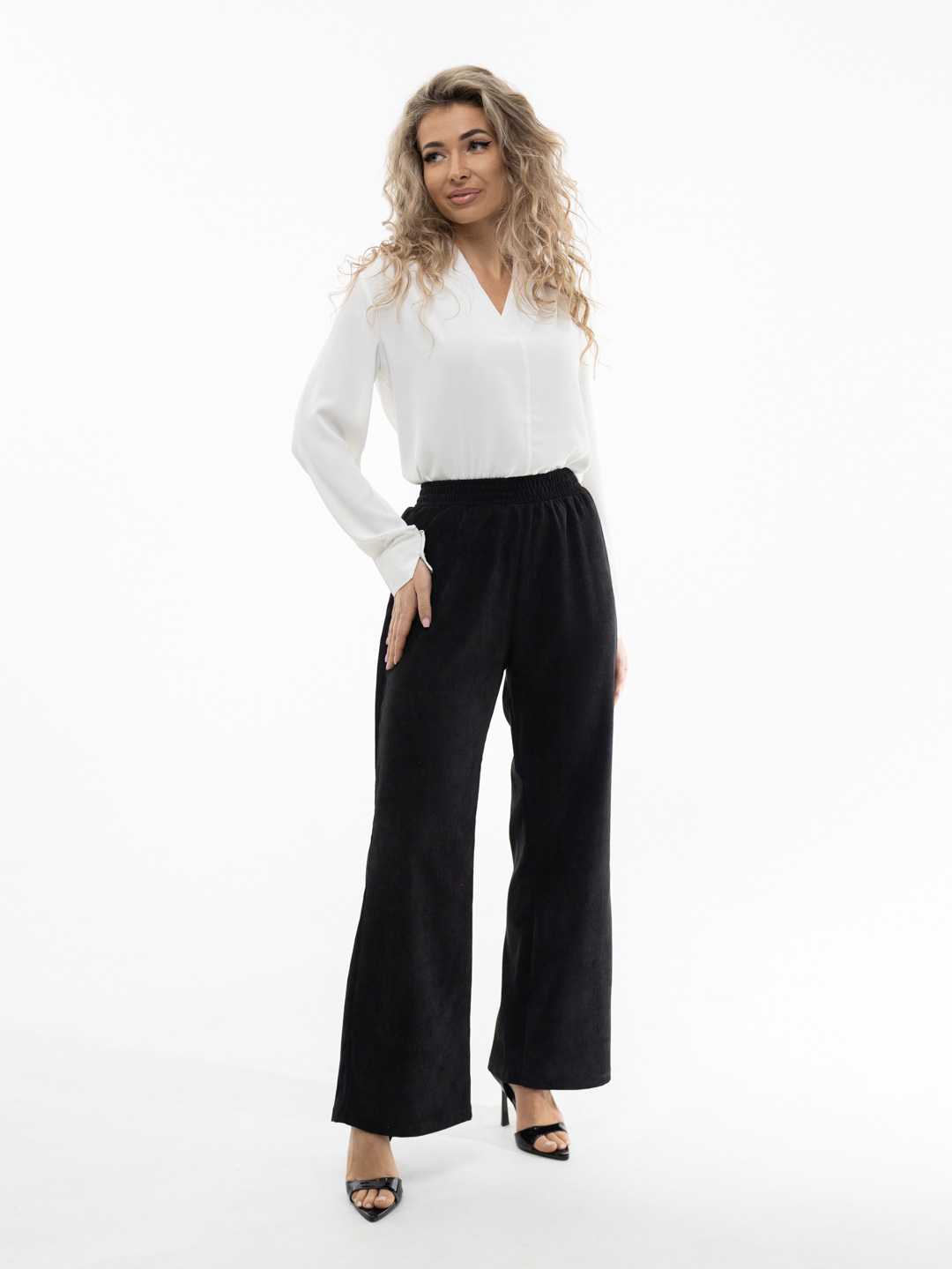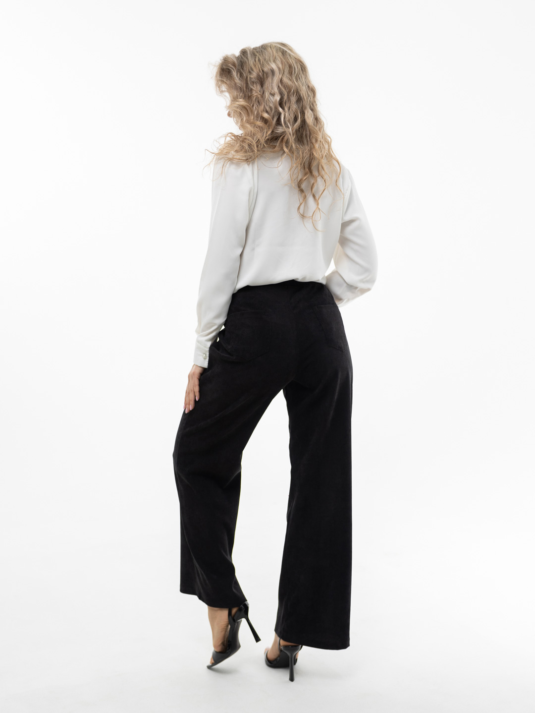 Брюки клеш из микровельвета с высокой посадкой, на поясе-резинке, выполненной на поясной машине, сзади два накладных кармана.