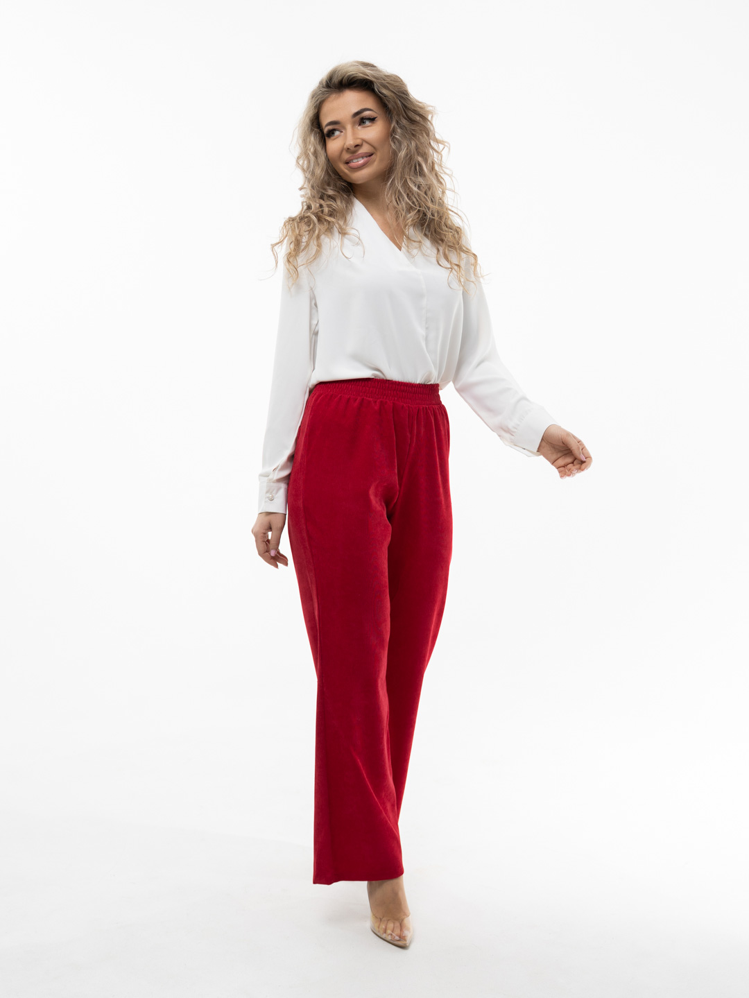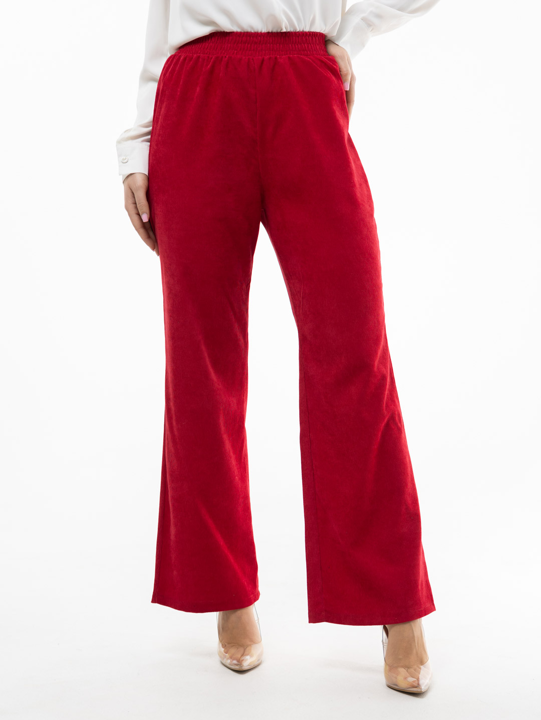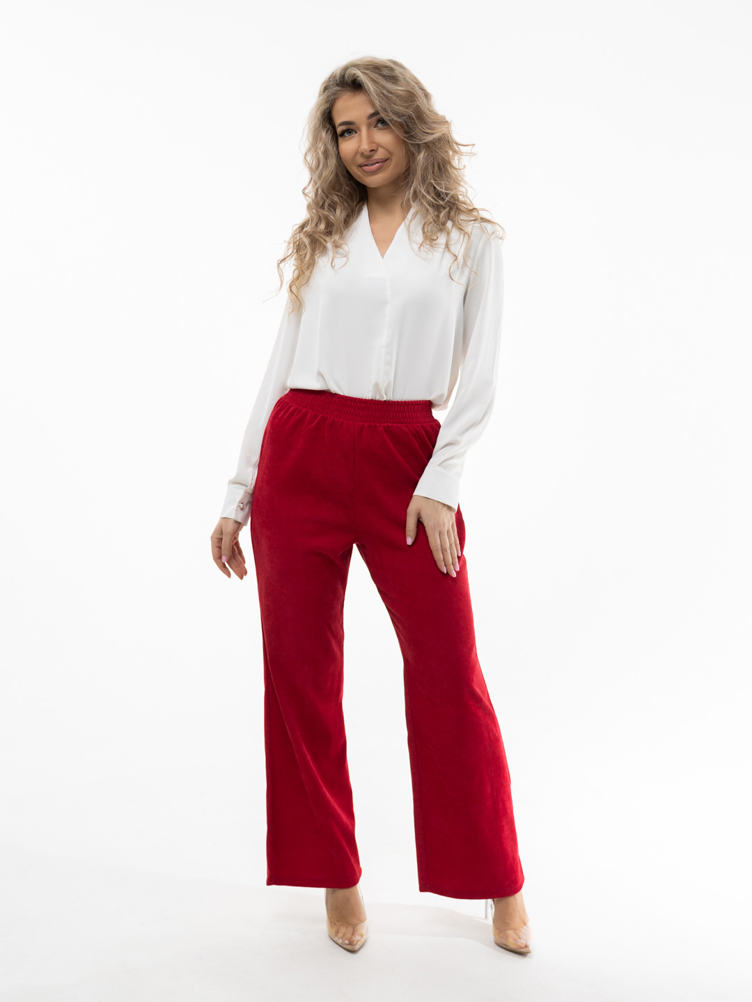 Брюки клеш из микровельвета с высокой посадкой, на поясе-резинке, выполненной на поясной машине, сзади два накладных кармана.