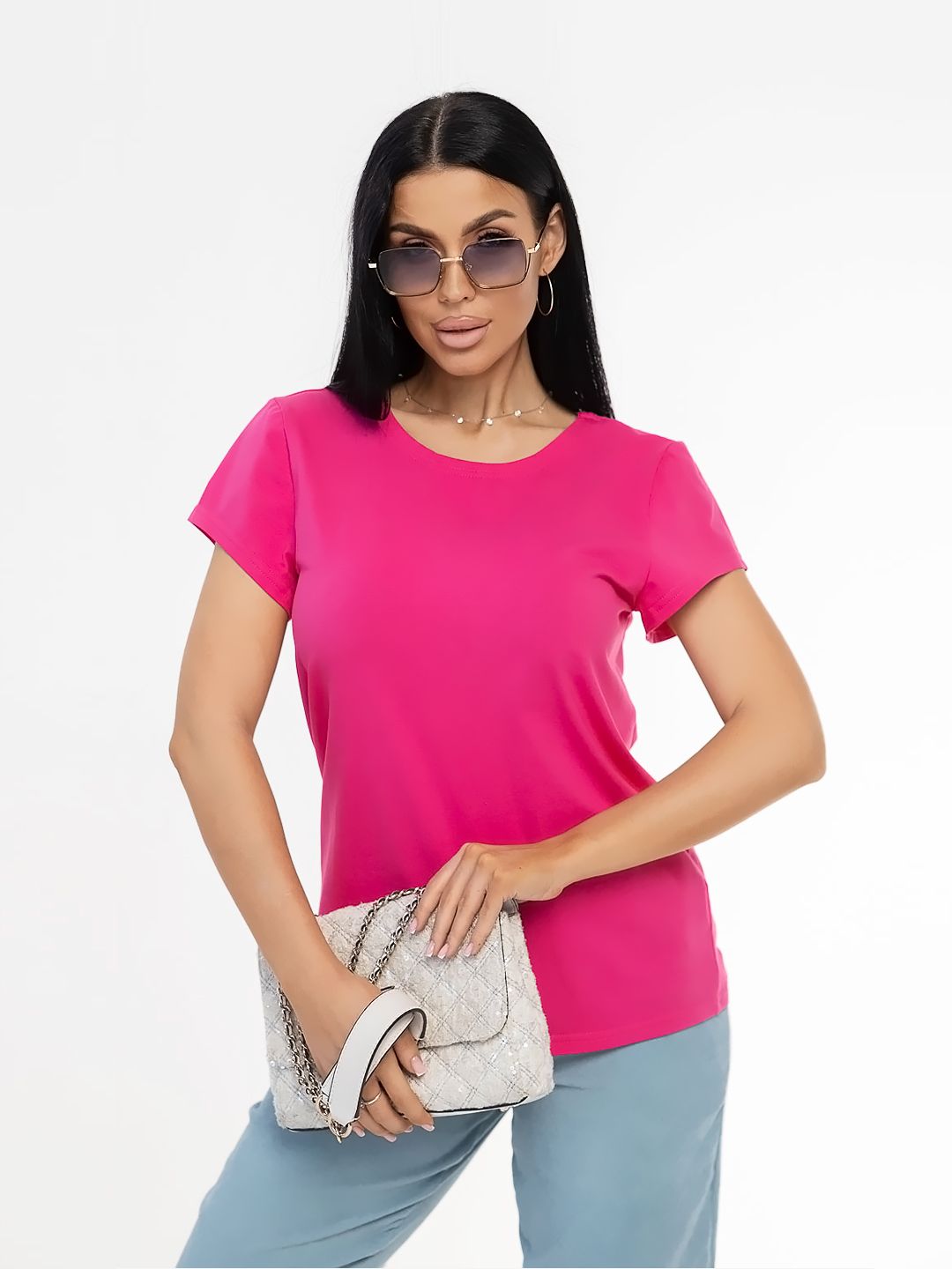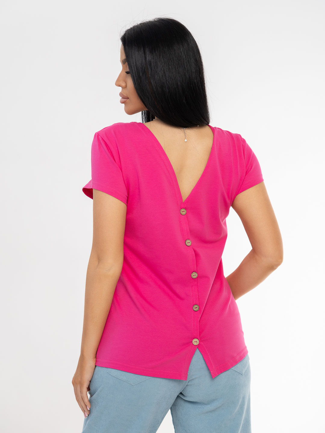 Футболка оригинального кроя, спинка выполнена на запах с фальшивой застежкой на пуговицы. Футболка представлна в большой цветовой палитре.