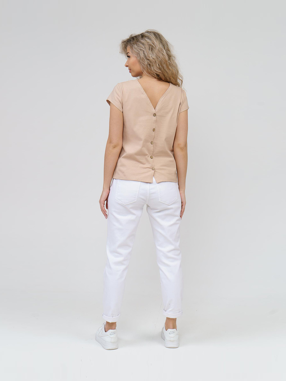 Футболка с оригинальным кроем, спинка выполнена на запах с фальшивой застежкой на пуговицы. Изделие представлено в нескольких базовых цветах.