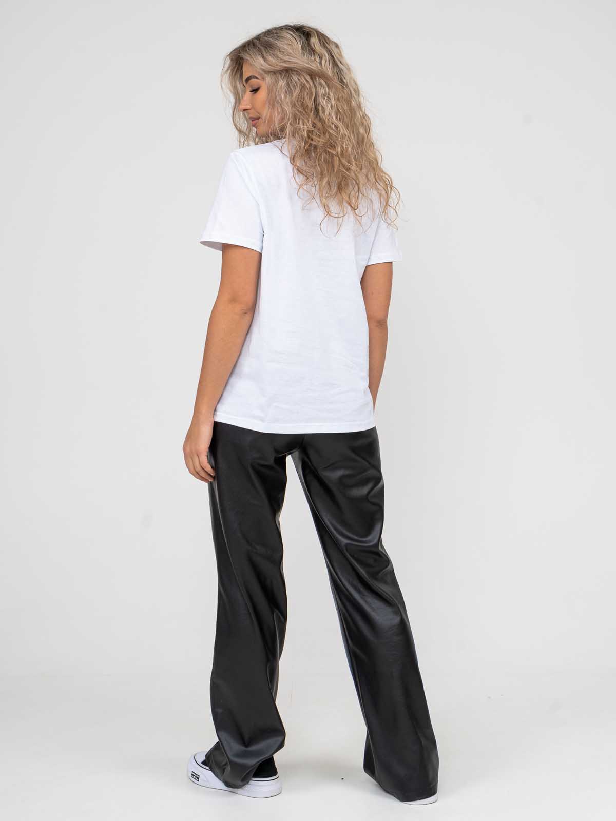 Футболка женская, трикотажная, прямого силуэта, с О-образной горловиной. Рукав короткий, свободный. Модная печать на переде.