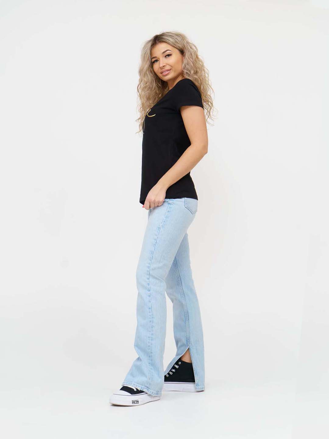 Базовая женская футболка, прямого силуэта, с О-образной горловиной и коротким рукавом. Представлена в 3 базовых цветах. Спереди печать на полочке.