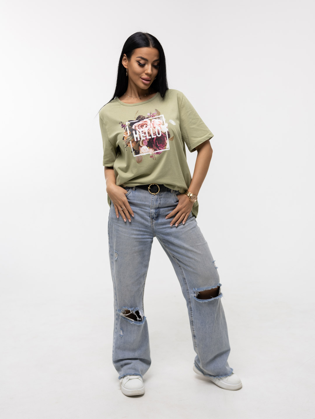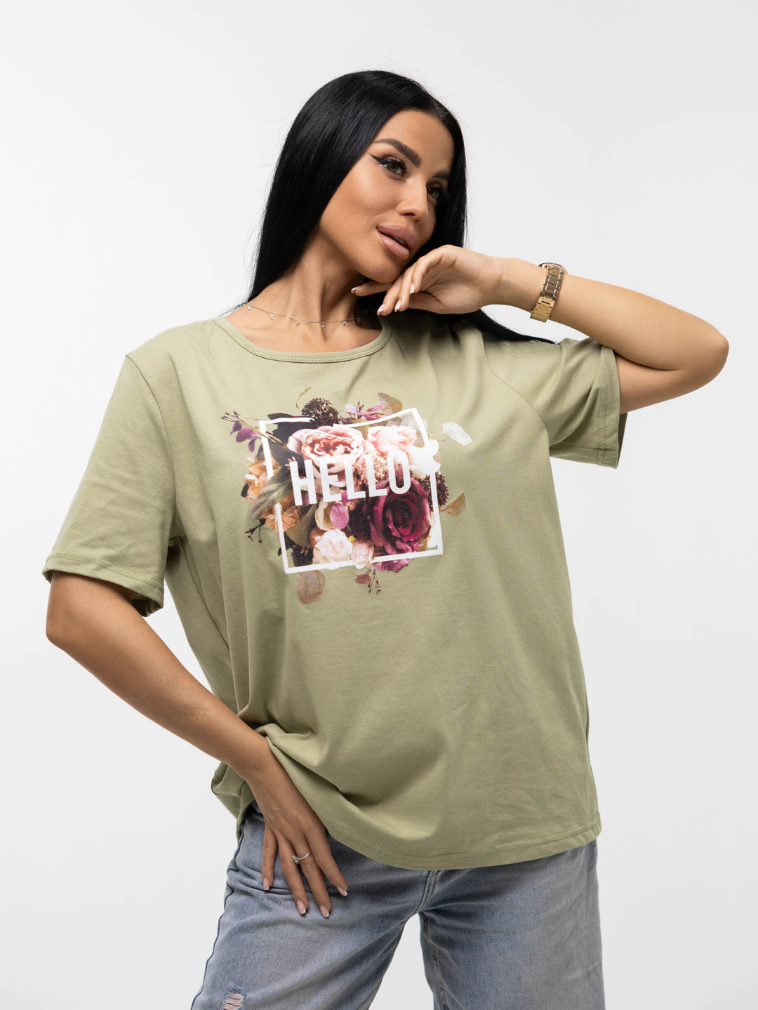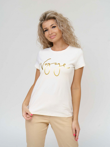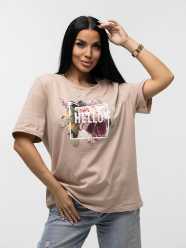 Футболка женская, прямого силуэта с принтом, О-образной горловиной. Рукав короткий, свободный. Футболка выполнена из трикотажного полотна 100% хлопка.