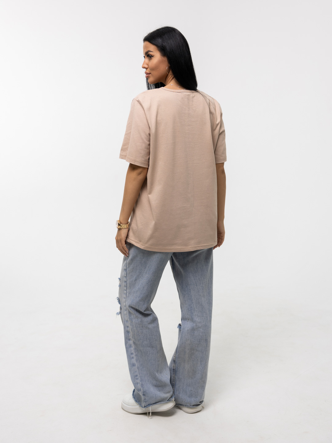 Футболка женская, прямого силуэта с принтом, О-образной горловиной. Рукав короткий, свободный. Футболка выполнена из трикотажного полотна 100% хлопка.